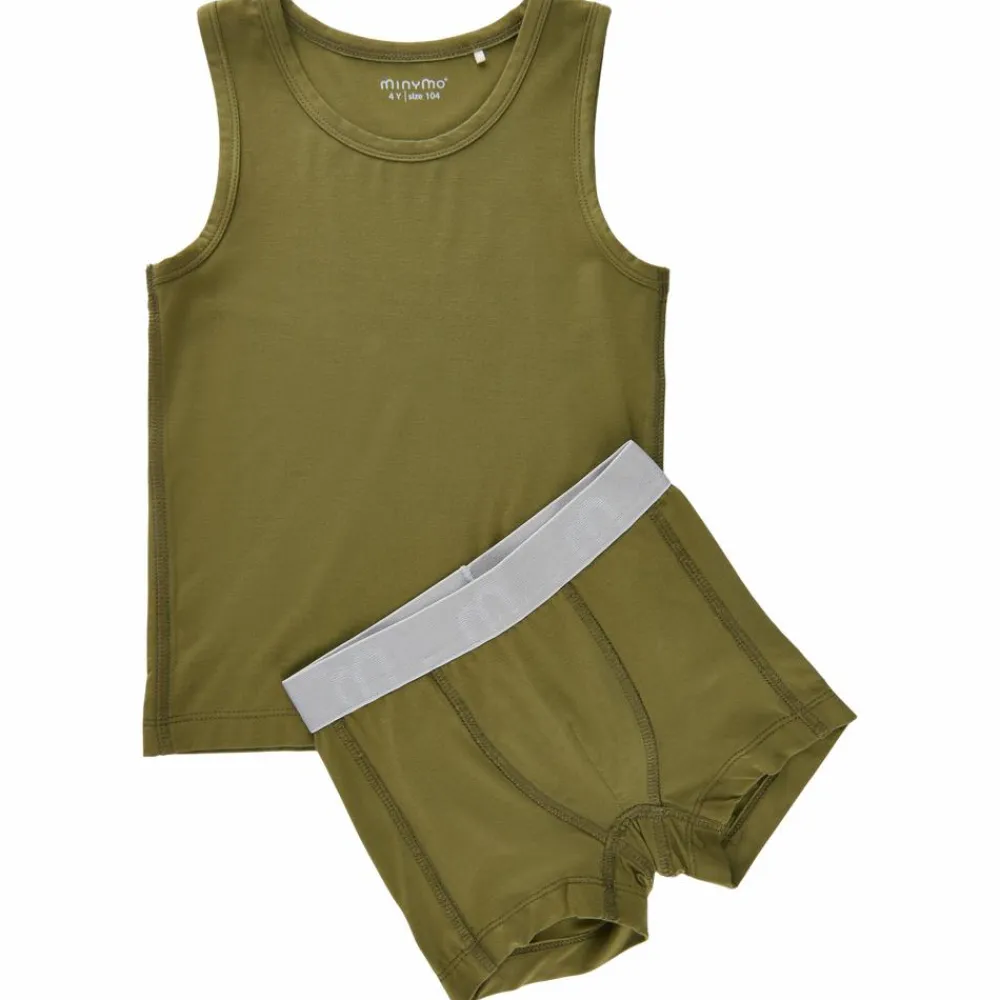Undertøjssæt bestående af et par underbukser og en tank top. Sættet er lavet af bambus viskose, som er blødt mod huden og behageligt at have på, da det naturligt tilpasser sig kroppens temperatur. Underbukserne har elastik i taljen med Minymo logo.