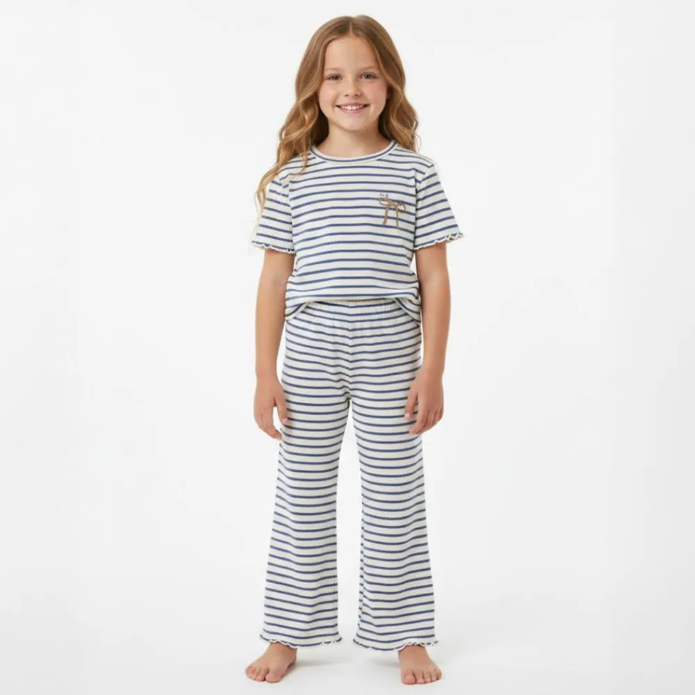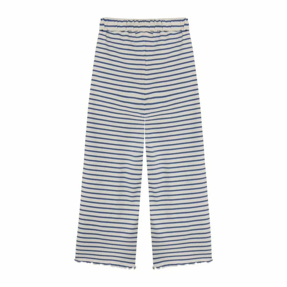 Smalle striber og den lille bølgekant ved anklerne afrunder et sødt og tidløst look. Match med t-shirts og toppe til hverdagen eller vælg bløde bluser og sweatshirts på kølige dage.