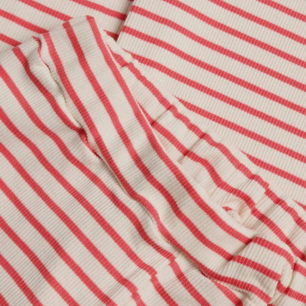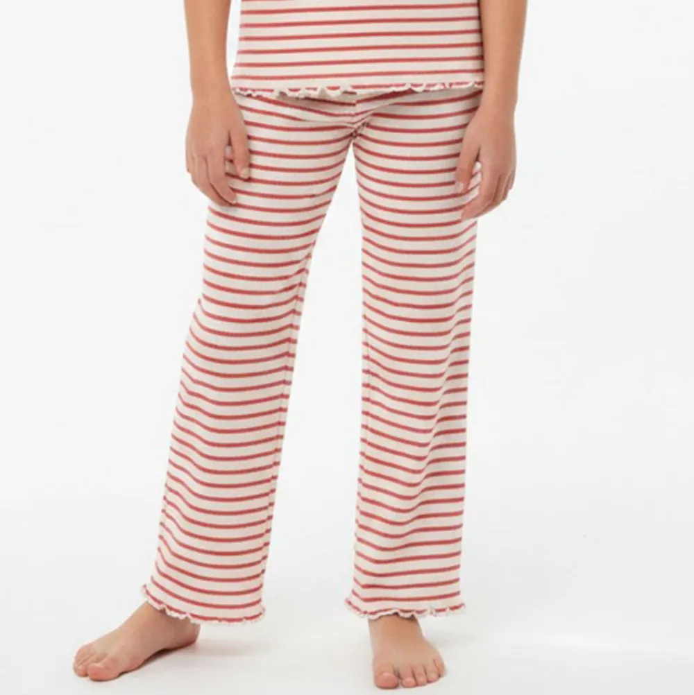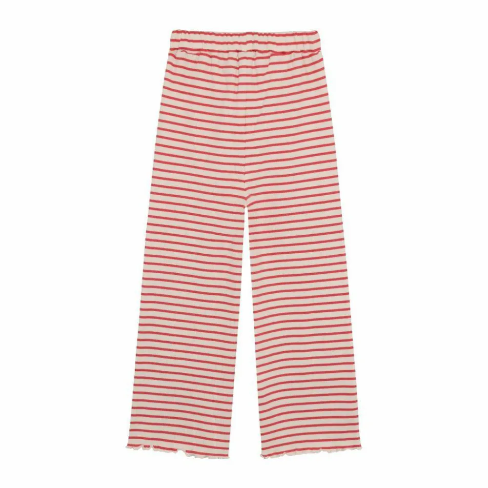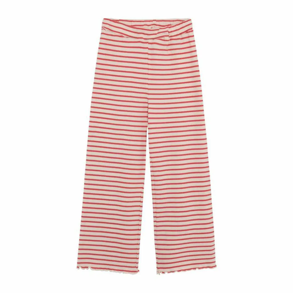 Disse stribede bukser i “Spiced Coral” og råhvid har en blød ribstruktur, der føles skøn mod huden. Den elastiske talje og den afslappede pasform giver frihed til bevægelse, mens de små rynkekanter ved linning og ankler tilfører en fin detalje. Materialet med stræk følger kroppen uden at stramme.