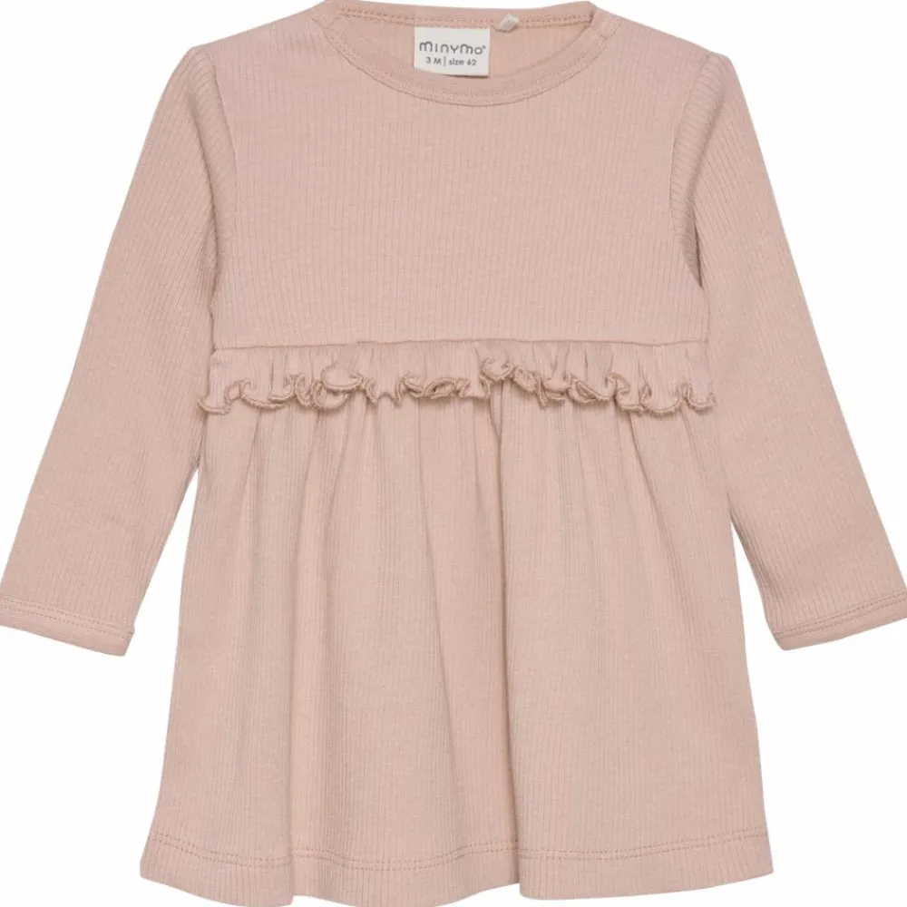 Minymo ribbet kjole med stretch og vidde i bunden. Kjolen har lange ærmer og flotte flæser under brystet.