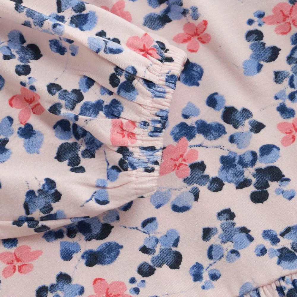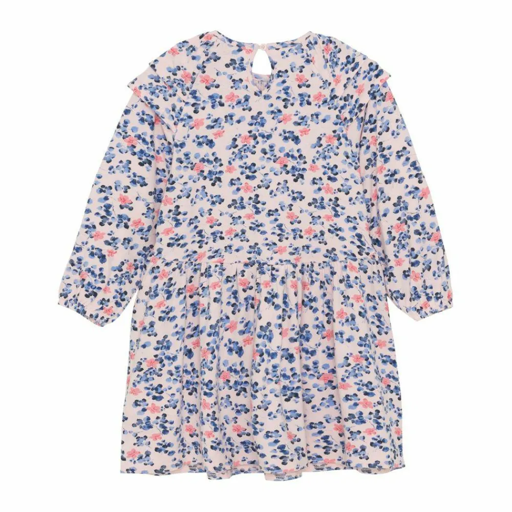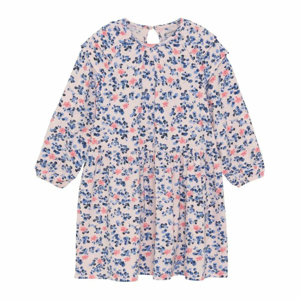 Fin langærmet kjole med allover print fra Minymo. Kjolen er lavet i en viskoseblanding og har et flot blomsteprint over det hele. Kjolen har ekstra lag på skulderen og stofsamlinger forskellige steder, hvilket giver et rigtig flot look. Elastik i håndleddene, som sikrer en behagelig pasform af ærmerne.