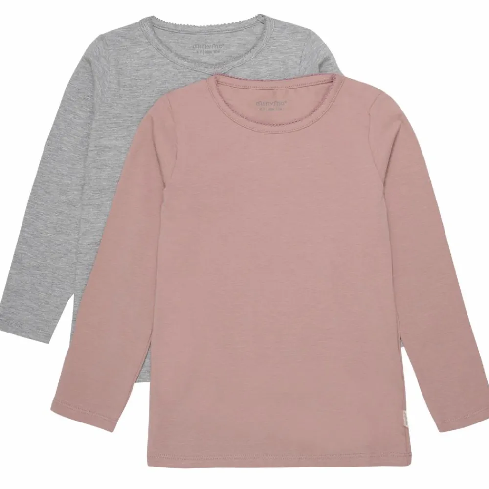 Minymo langærmet T-shirt 2-pak. Super lækre bluser med lange ærmer og fine detaljer i et virkelig blødt og elastisk materiale. Blusen har rund halsudskæring med hæklet kant.