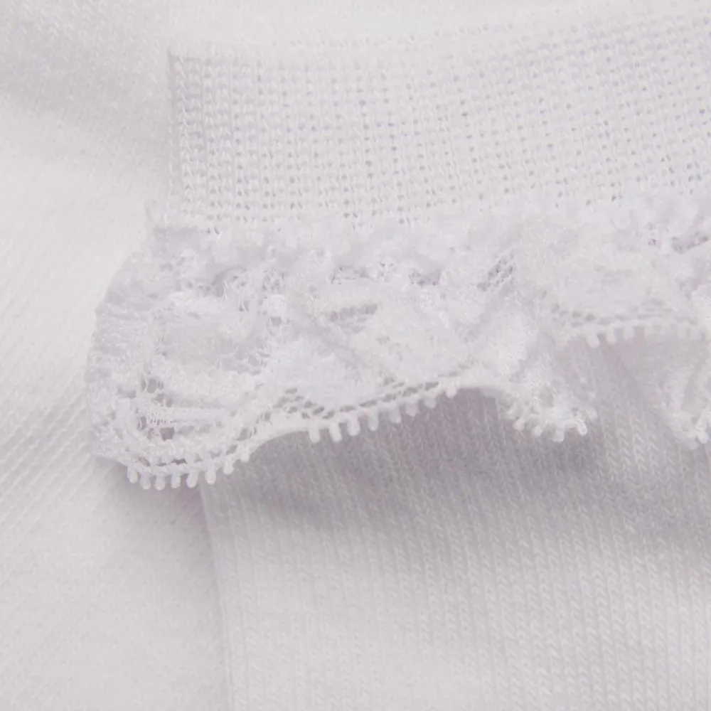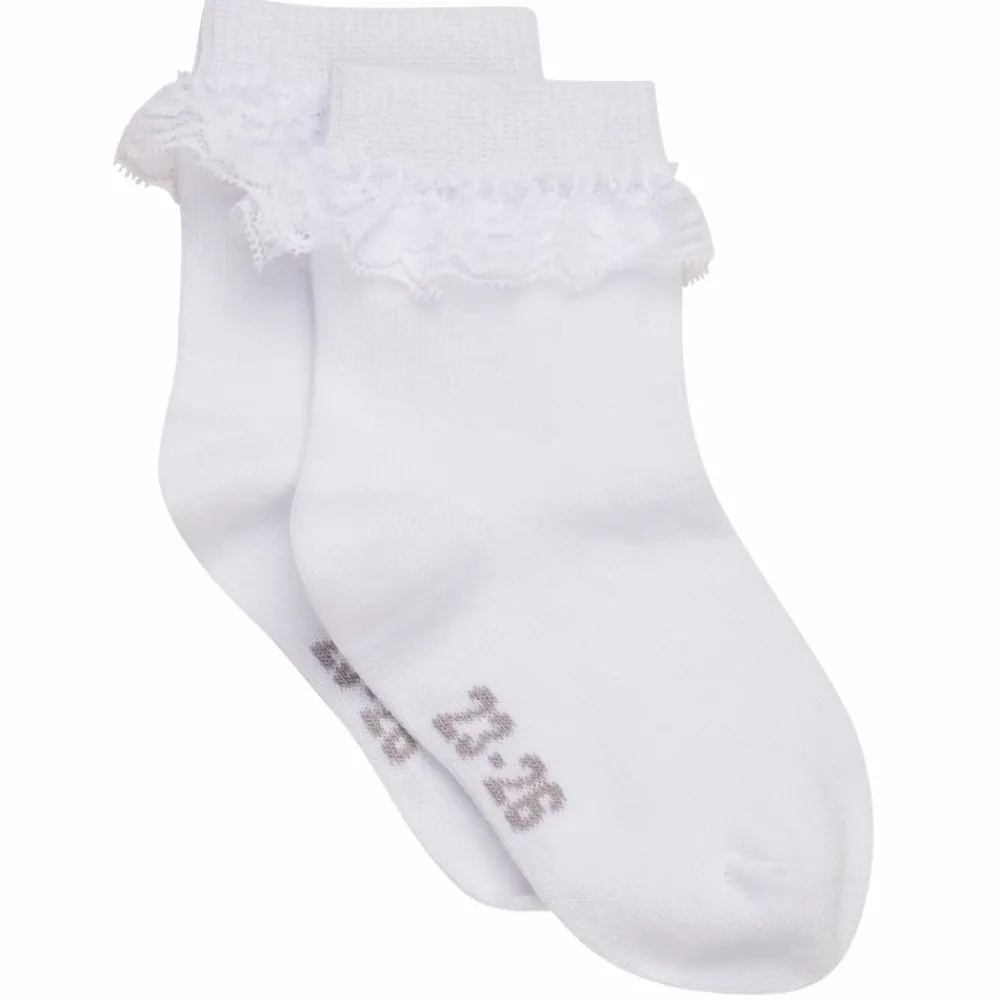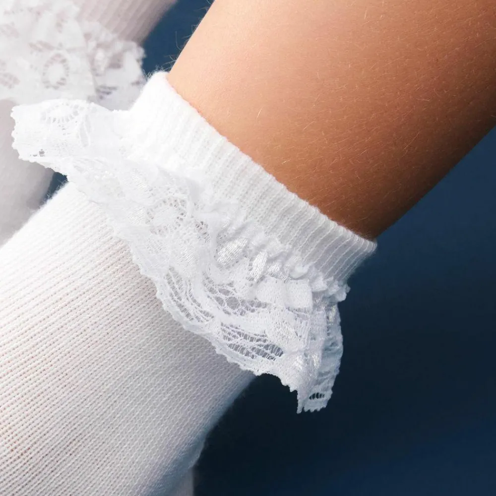 Strømper med blondekant rundt om anklerne. Strømperne har ingen syninger henover tæerne, også kaldet “soft toe”.