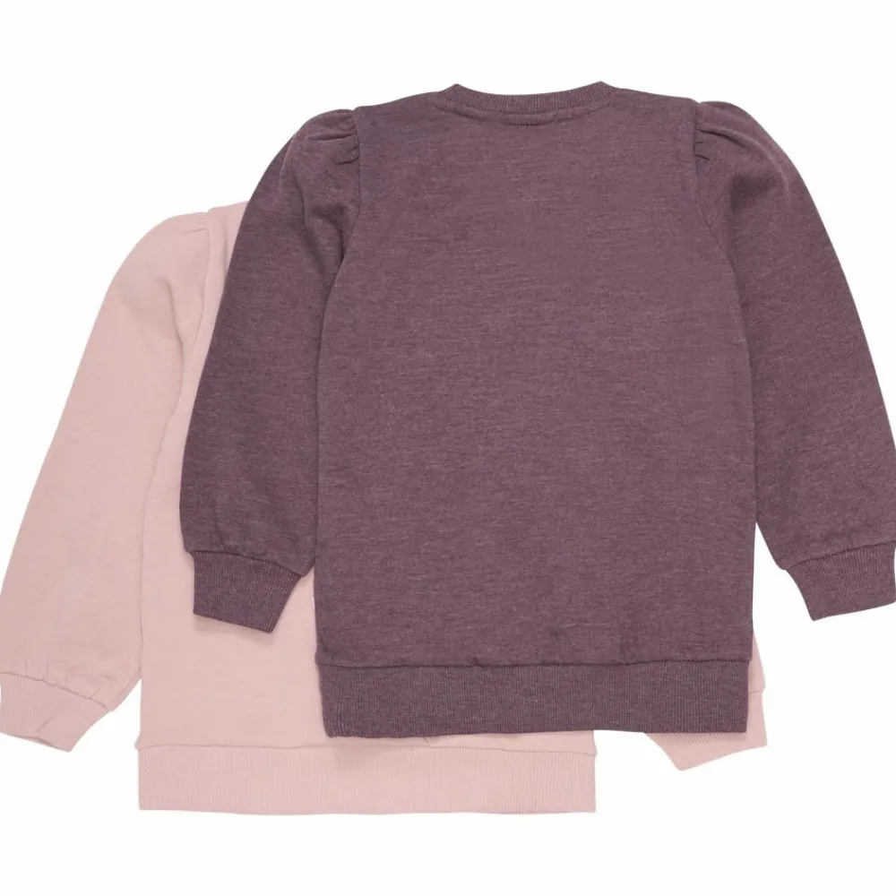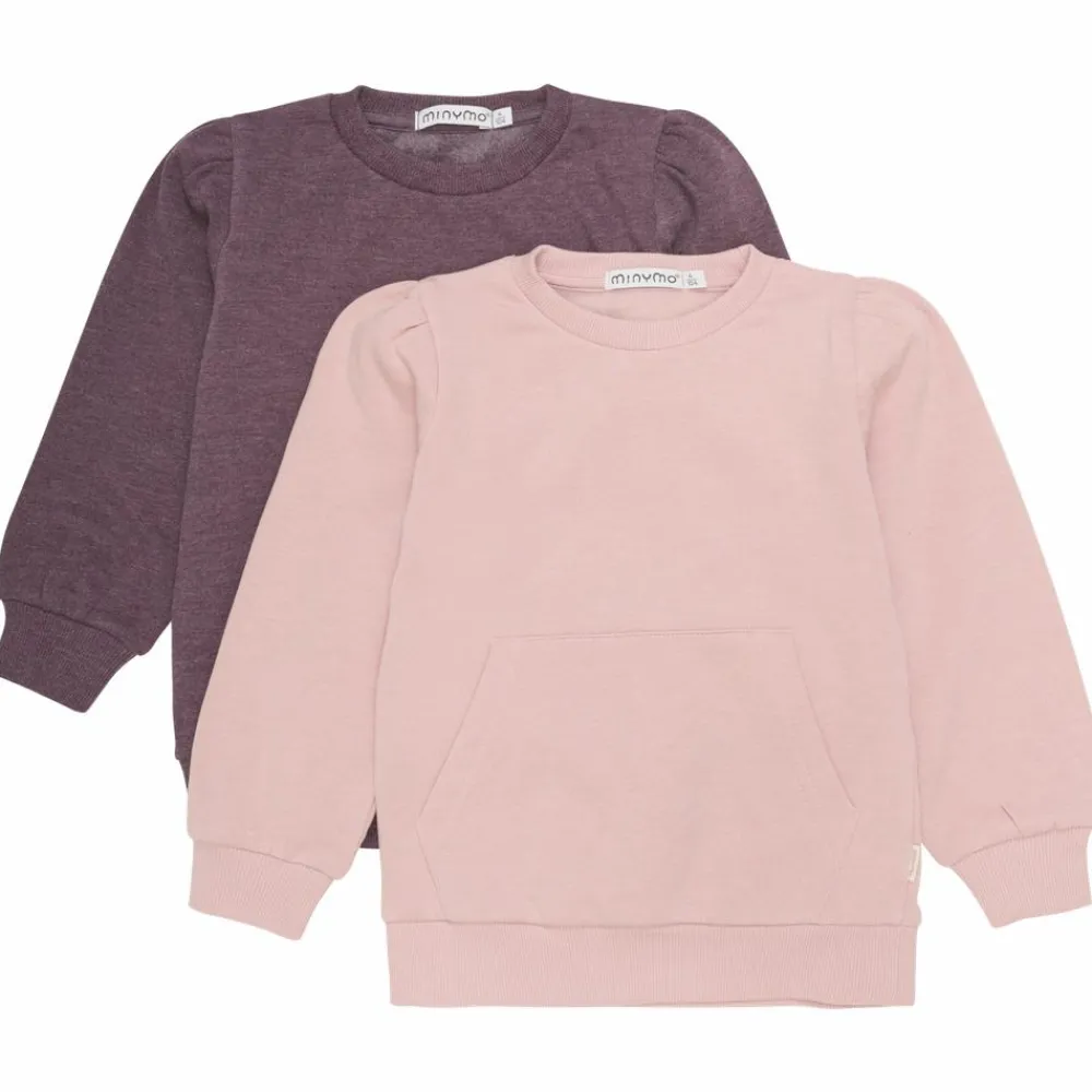 Minymo 2-pak bestående af to par sweatshirts i french terry. Trøjerne har en ribkant i halsudskæring, ærmer og i taljen. Trøjen har kængurulomme samt pufærmer.