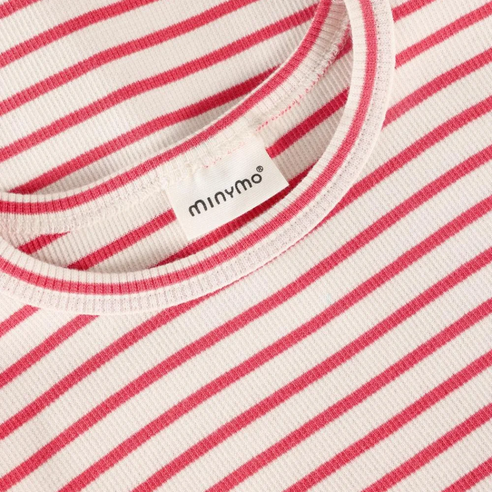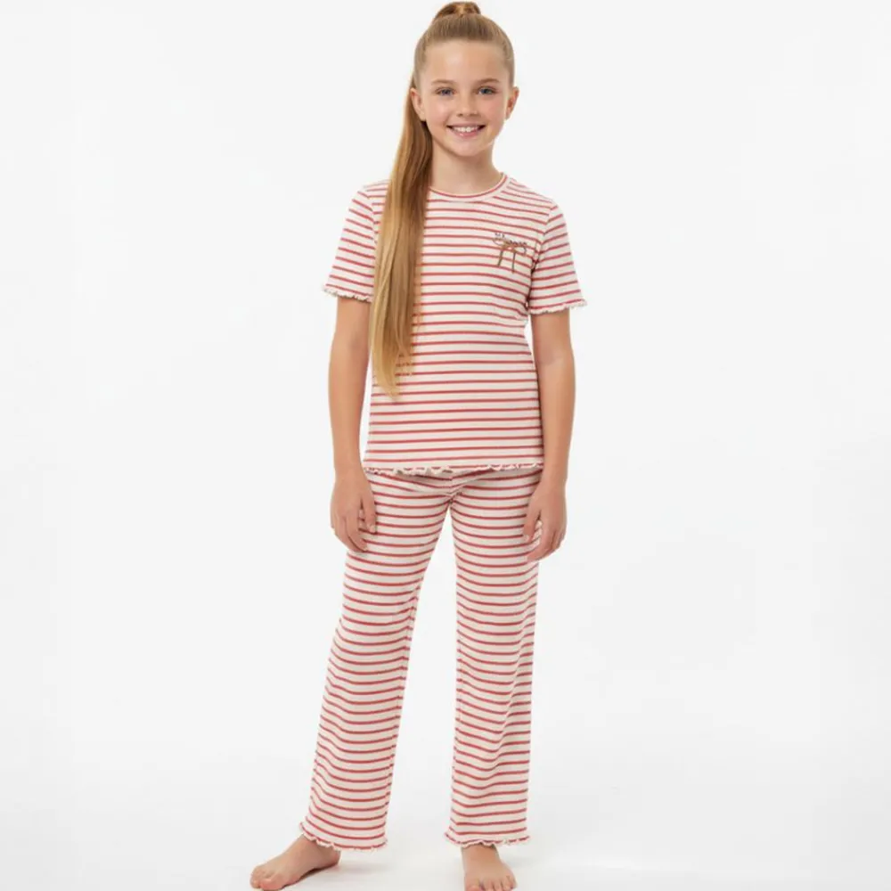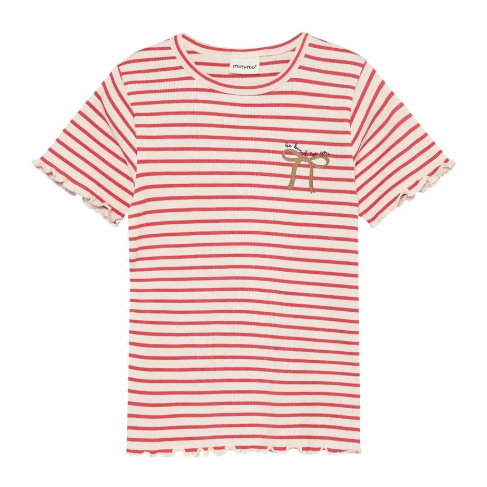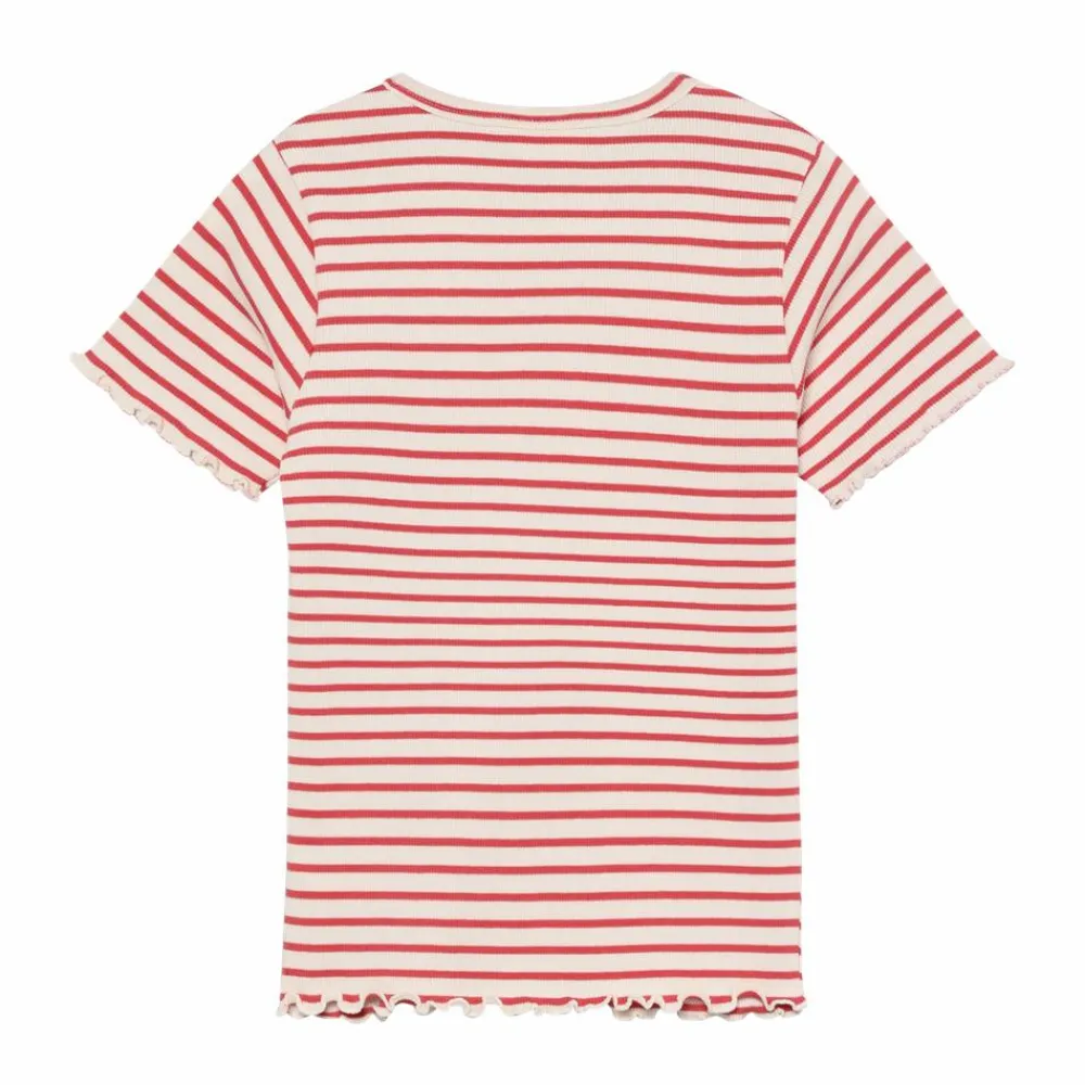 En blød og strækbar t-shirt til piger med varme striber i spiced coral og creme. Den klassiske runde hals og den let ribbede kvalitet giver en behagelig pasform, mens bølgede kanter på ærmer og kant tilføjer et legende udtryk. En lille, broderet sløjfe på brystet giver en nuttet detalje.