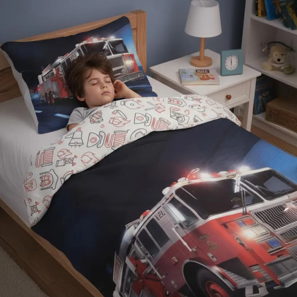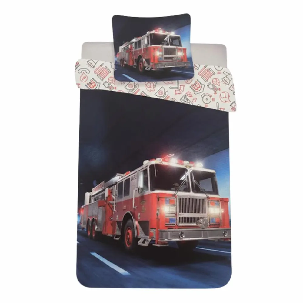 Brandbil sengesæt i et cool og actionfyldt design. Med brandbil sengesættet kan du give børneværelset et spændende udtryk, som børnene vil elske. Sættet er dekoreret med et motiv af en brandbil i action med blinkende lygter. Perfekt til børn der elsker fart og action.