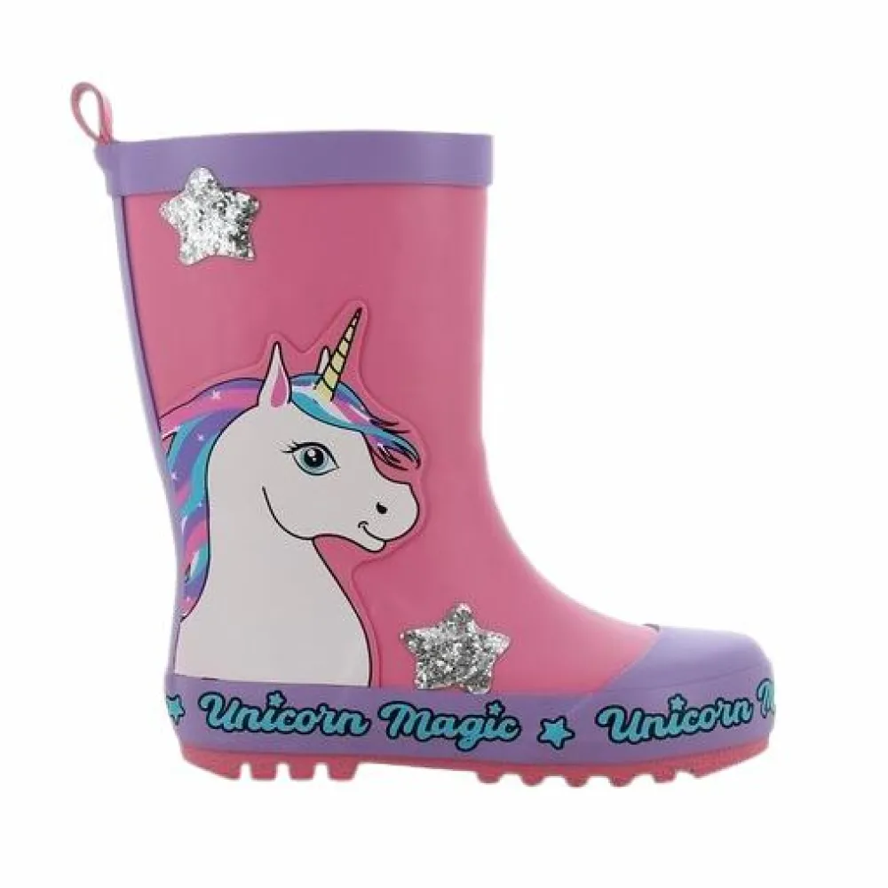Gummistøvler med sejt motiv af en unicorn. De vandtætte støvler har en strop bagpå, så de er lette at komme i. Gummistøvlerne til børn er i 100% naturgummi. Et rigtig godt valg til udendørsaktiviteter i al slags vejr. Støvlerne er forede med jersey og holder barnets fødder tørre og lune.