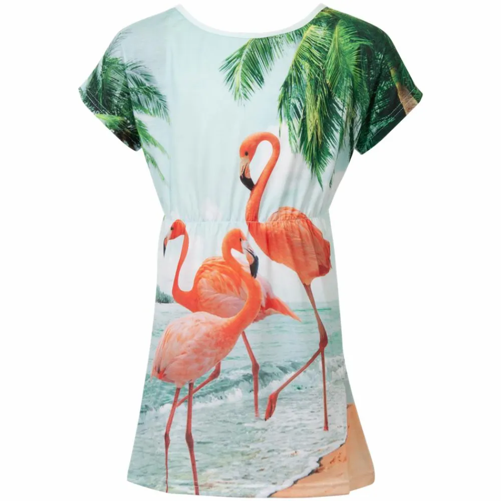 Fin pigekjole med flamingo print på fronten. Kjolen har korte ærmer og rund hals.