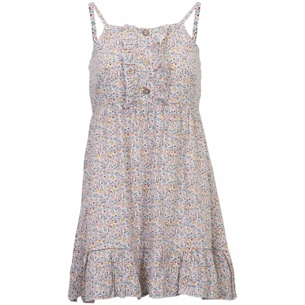 Flot pigekjole i et fint sommerligt design med all over print. Sommerkjolen er let og luftig og falder behageligt mod kroppen. Kjolen har smalle stropper, pynteknapper og flæsedetaljer.