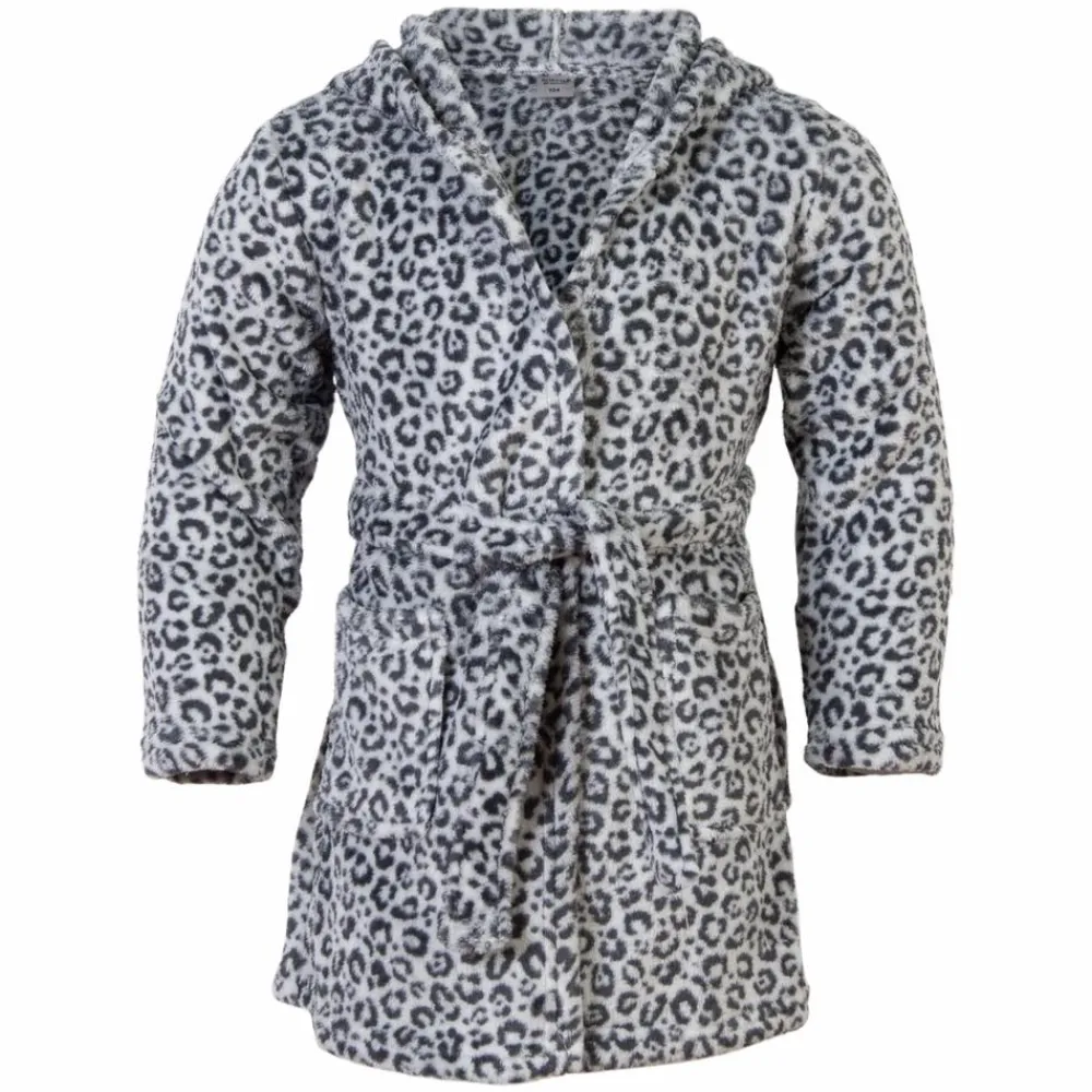 Pige morgenkåbe med leopard print. Morgenkåben har to lommer, hætte og bindebånd i taljen.