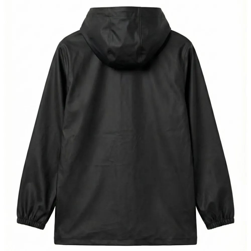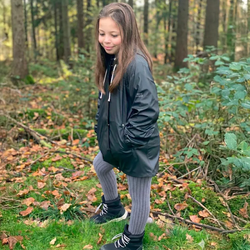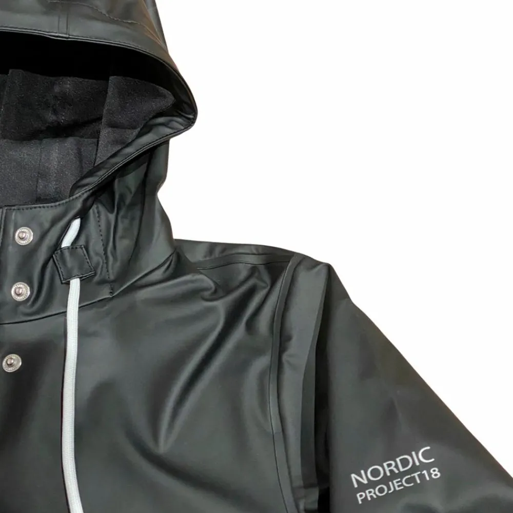Den mørke meteorite-farve giver et roligt udtryk, mens den rummelige pasform lader barnet bevæge sig frit. Hætte, lange ærmer og gennemgående lukning skærmer effektivt, så hverdagen kan fortsætte – fra skolevejen til legepladsen.