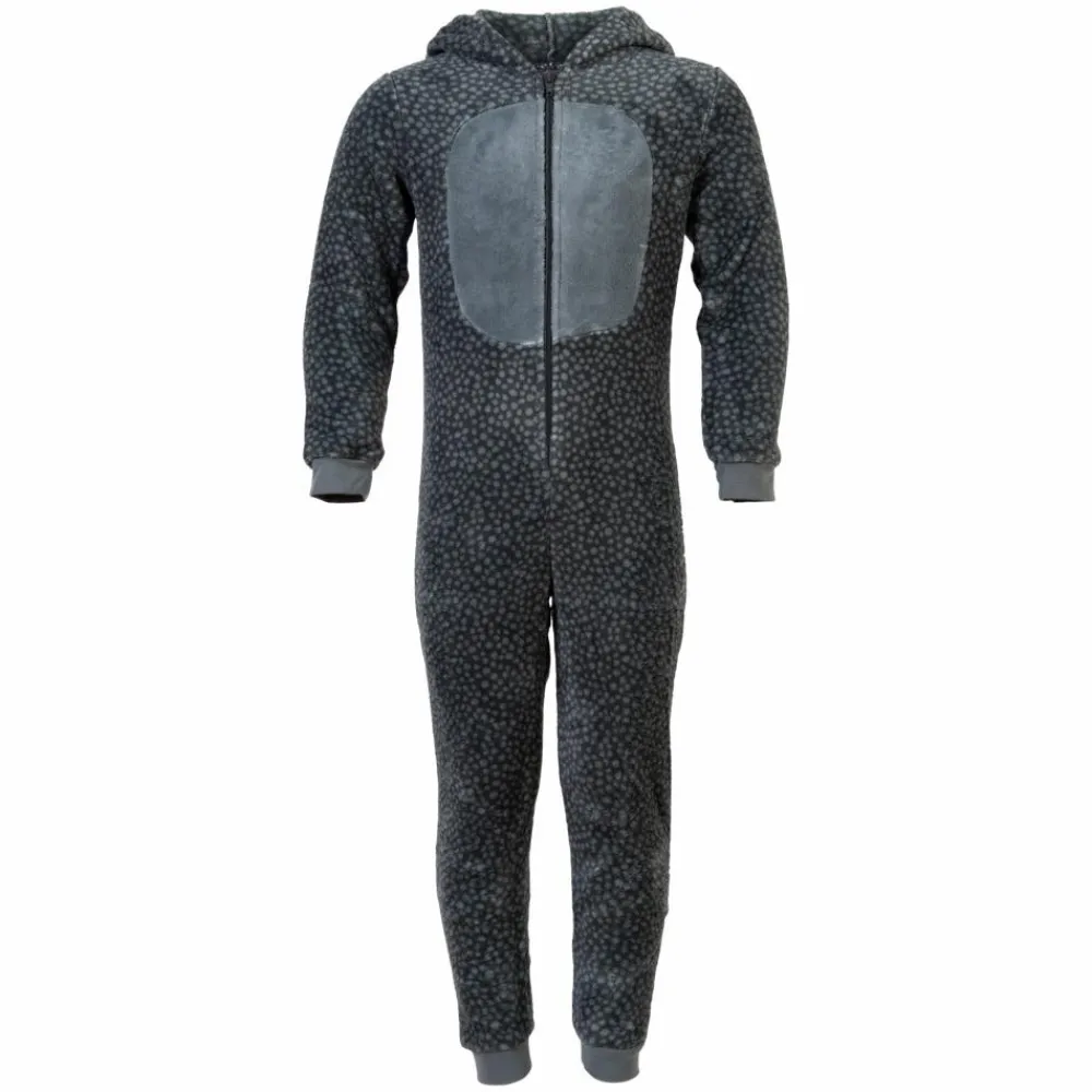 Outfitter drenge fleece heldragt. Blød fleece heldragt til børn med dyreprint og en hætte, der har krokodillelignende ansigt. Dragten har en gennemgående lynlåslukning og ribkanter ved ærmer og bukseben.