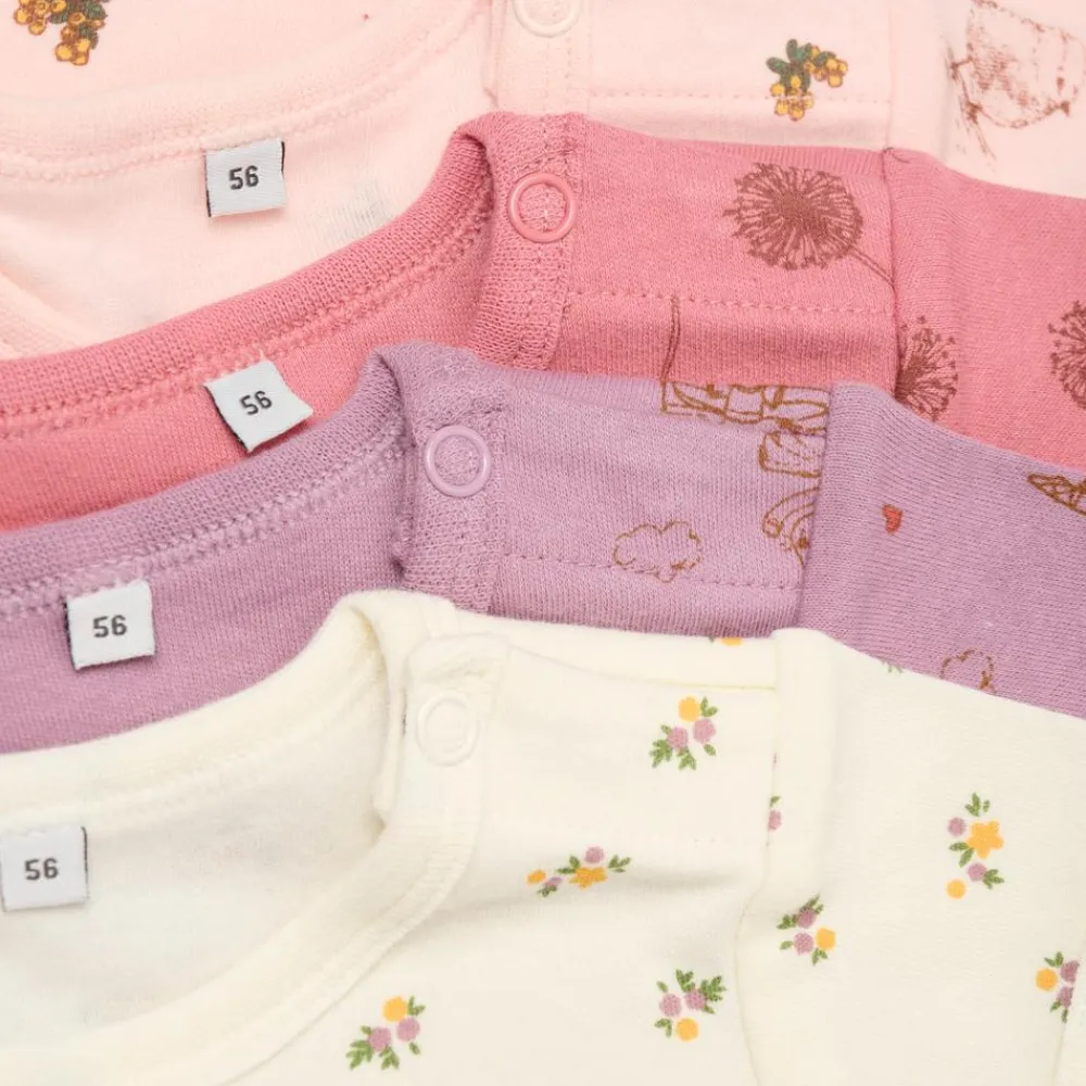Pippi baby kortærmet body 4-pak. Sød kortærmet body med print og med trykknapper imellem benene. Denne bodystocking har trykknap ved halsåbningen for nem af – og påklædning, samt 3 trykknapper ved skridtet, så det er let at skifte ble.