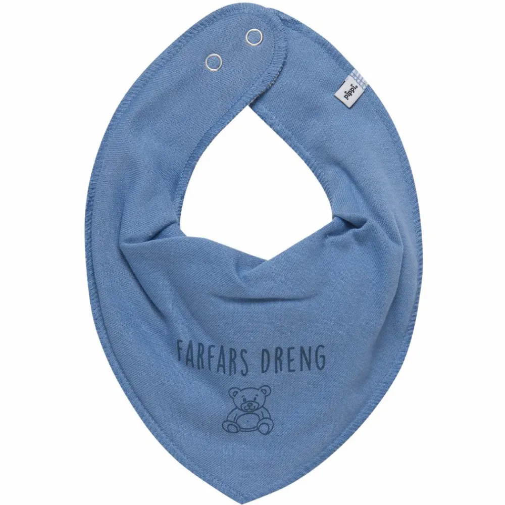 Savlesmæk med teksten “Farfars dreng”. Savlesmækken er lavet af økologisk bomuld og har justerbar knaplukning i nakken.