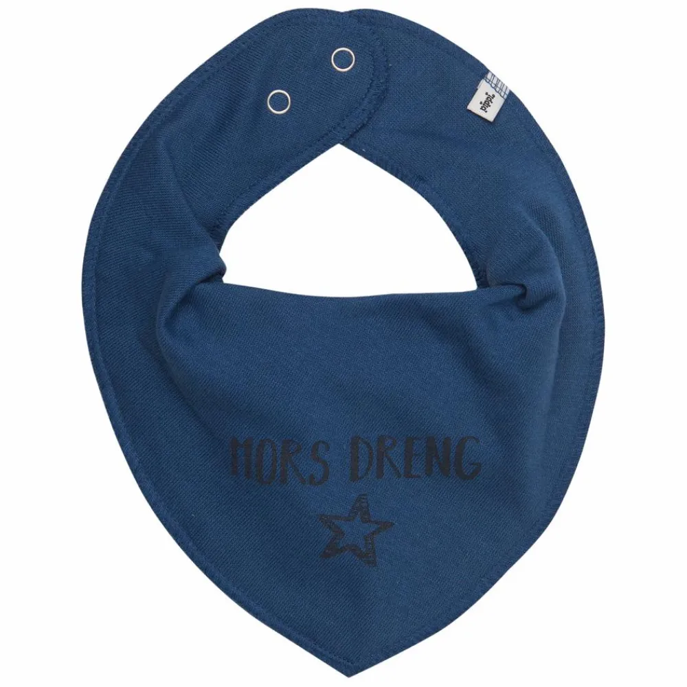 Savlesmæk med bandana inspireret look og teksten “Mors dreng”. Savlesmækken er lavet af økologisk bomuld og har justerbar knaplukning i nakken.