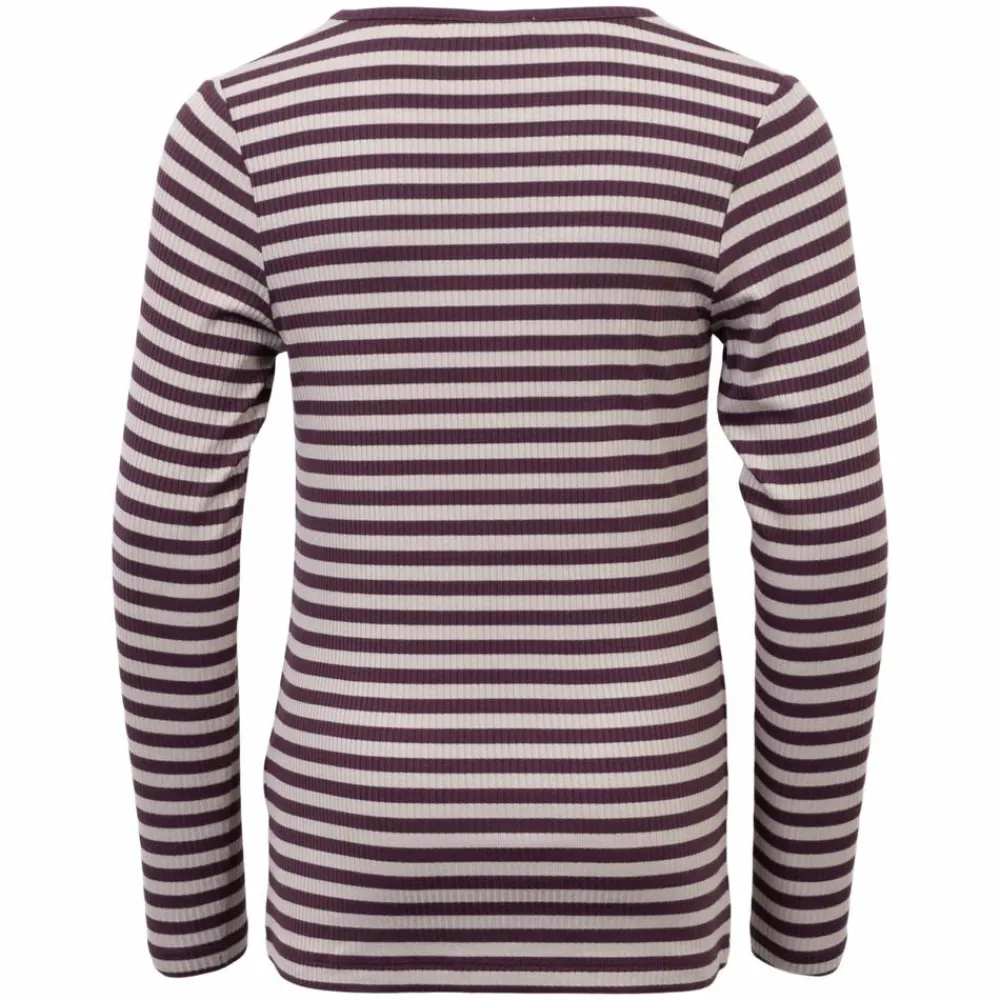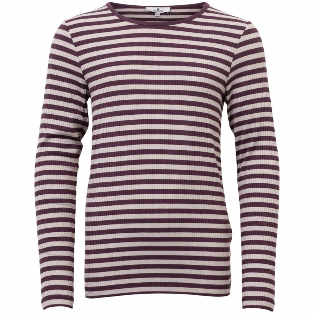 Denne langærmede t-shirt til piger kombinerer bløde ribstriber i farven “Crushed Violets” med en lys kontrast for et roligt, velklædt udtryk. Den runde hals og kropsnære pasform følger kroppen uden at stramme, så det føles rart hele dagen. Den fleksible kvalitet med 94% viskose og 6% elastan giver smidighed og et flot fald.