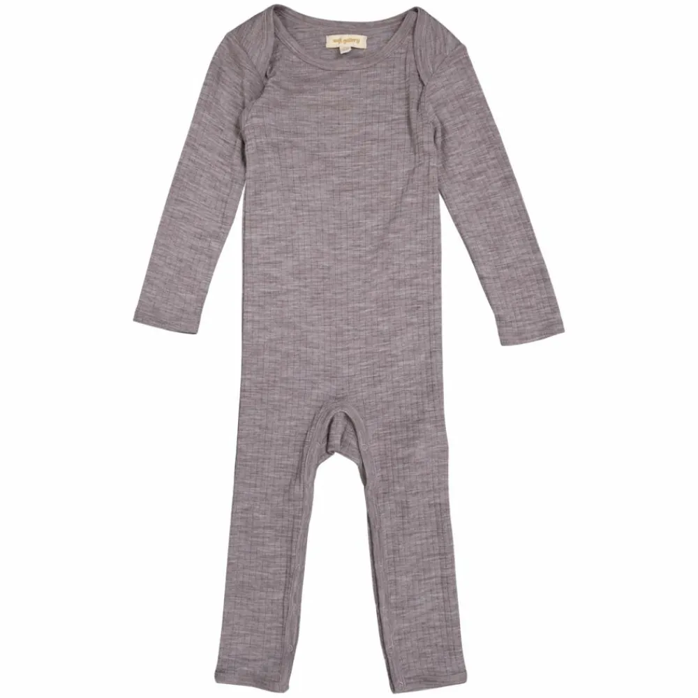 Soft Gallery baby heldragt i meleret lys brun. Heldragten har lange ærmer og ben og bred rib struktur. Den er lavet i det blødeste merinould og er særdeles strækbar. Dragten lukkes med trykknapper langs benene og i skridtet.