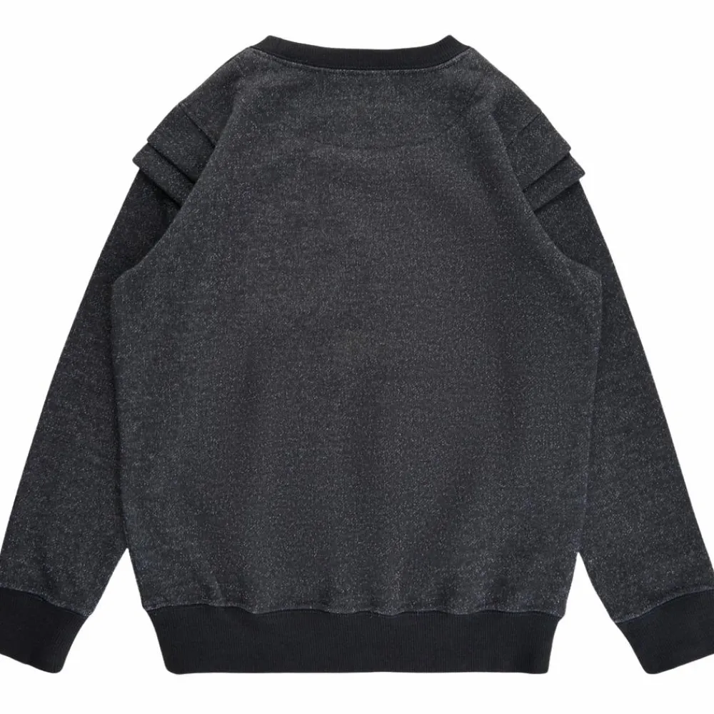 Sweatshirten er blød og behagelig, og er dejlig at have på. Sweatshirten har ribkant om halsen, ærmerne og i bunden. Flæsedetaljer ved skuldre og med glimmer.