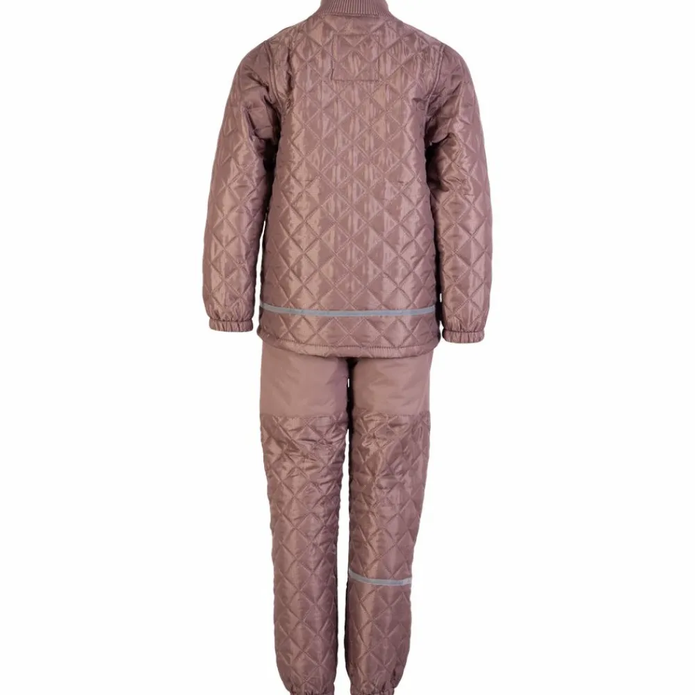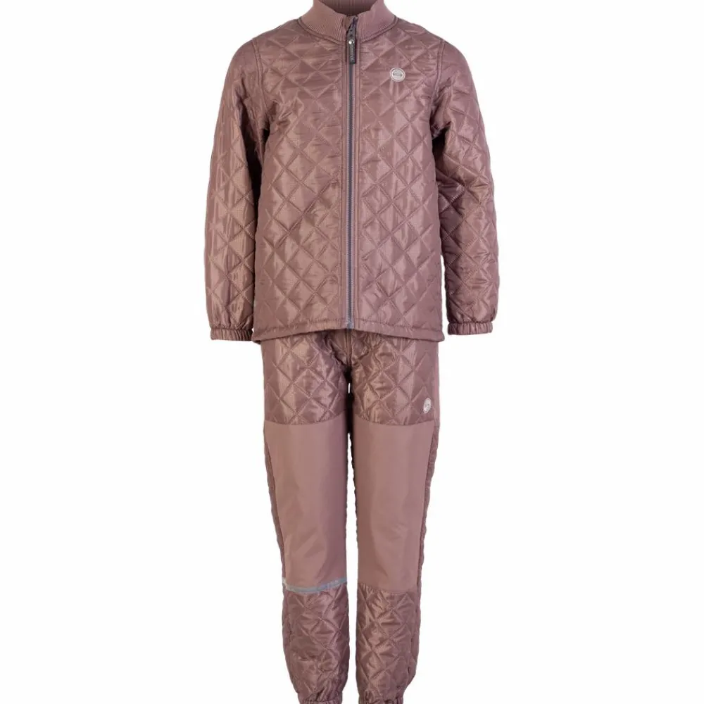 Lækkert termosæt bestående af jakke uden hætte og bukser med elastik i taljen. Jakken har gennemgående lynlås, ribkant i hals og refleks bagpå. Bukserne har regulerbar linning i bukser, reflekser på benet, elastik ved anklerne samt forstærkning på bagsiden og knæ.