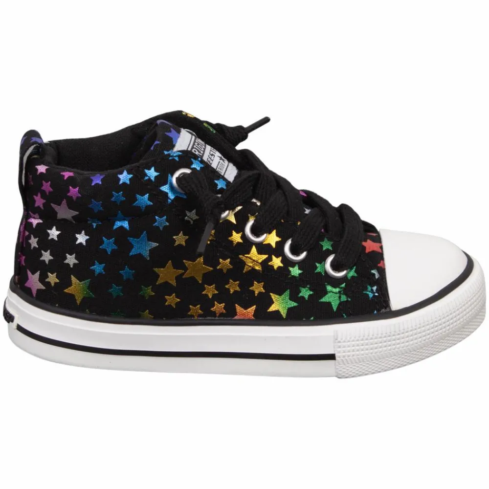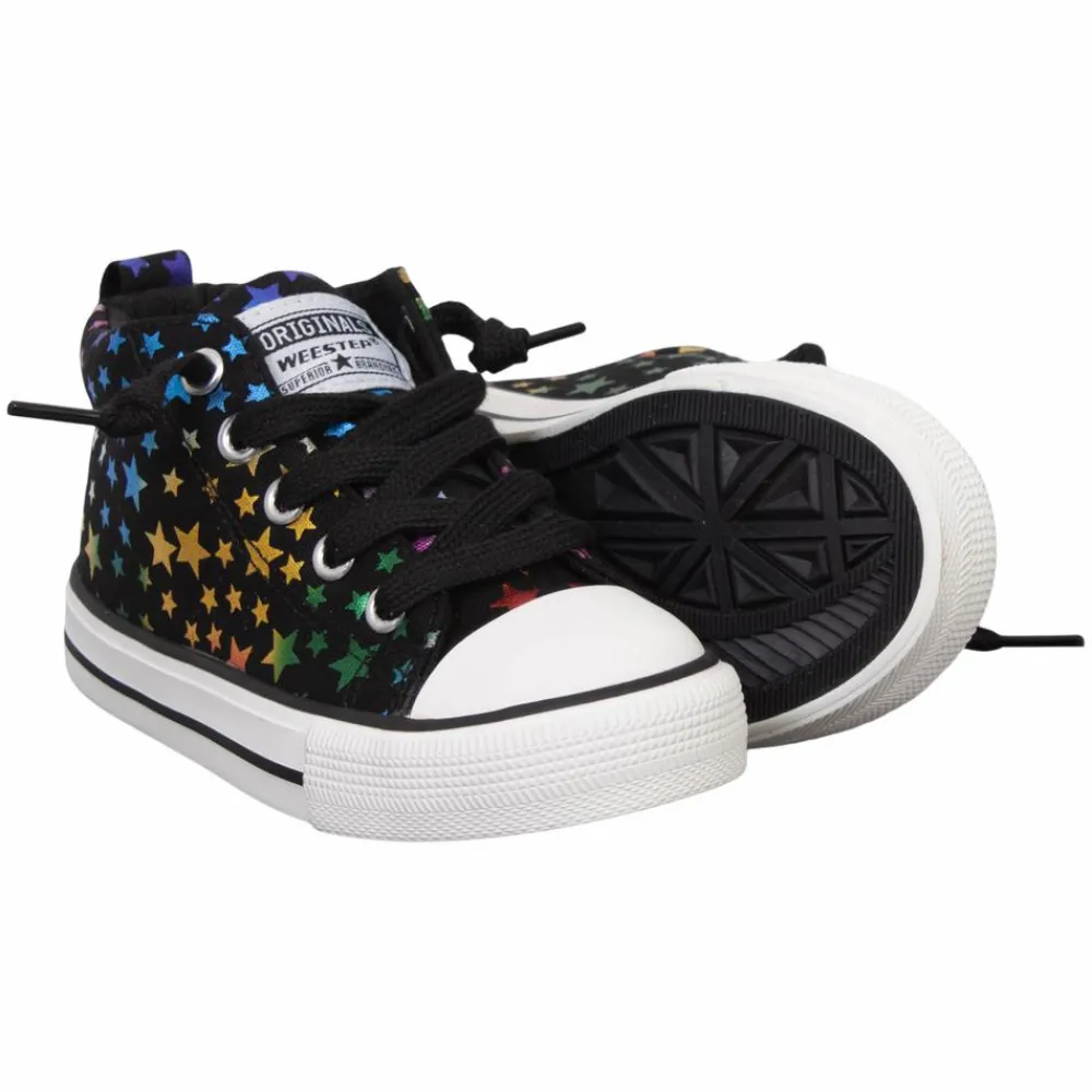 Weestep sneakers i sort farve med stjerneprint i forskellige farver. Skoene har et klassisk design med en høj kant, hvide snørebånd og en solid gummisål.