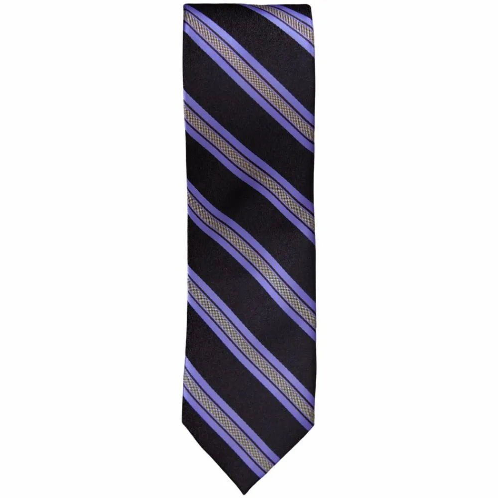 Klassisk slips i sort med sorte og hvide mønstrede striber samt tynde, lilla striber.