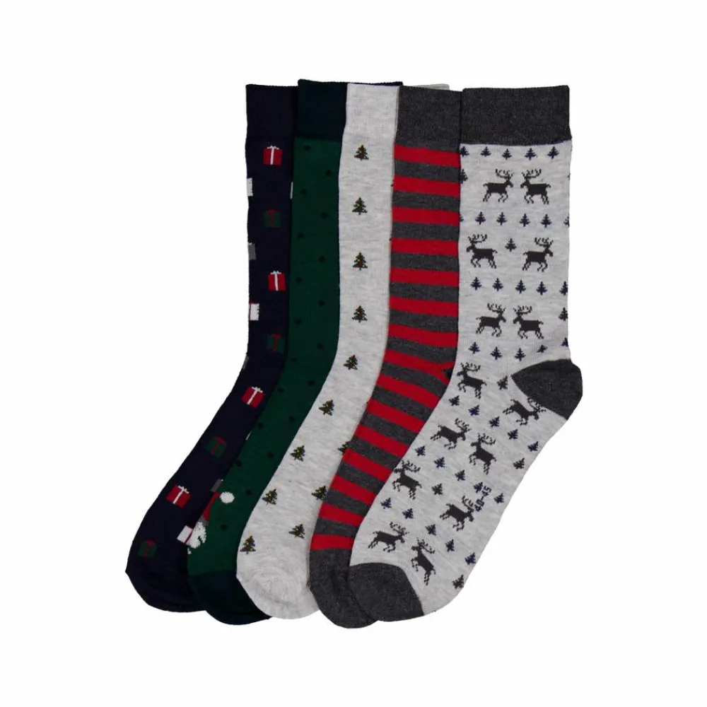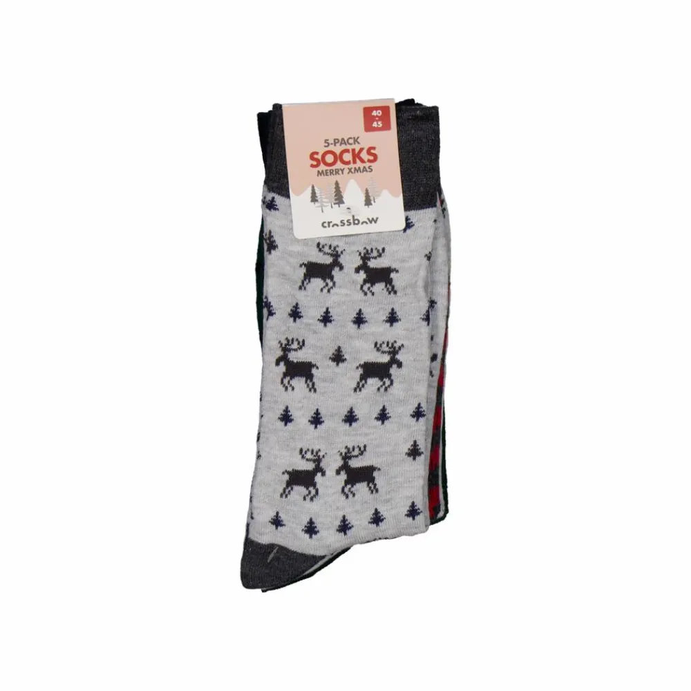 Crossbow 5-pak herre julestrømper. 5 par strømper med forskellige mønstre og farver. Strømperne går over anklerne med en let elastikkant.