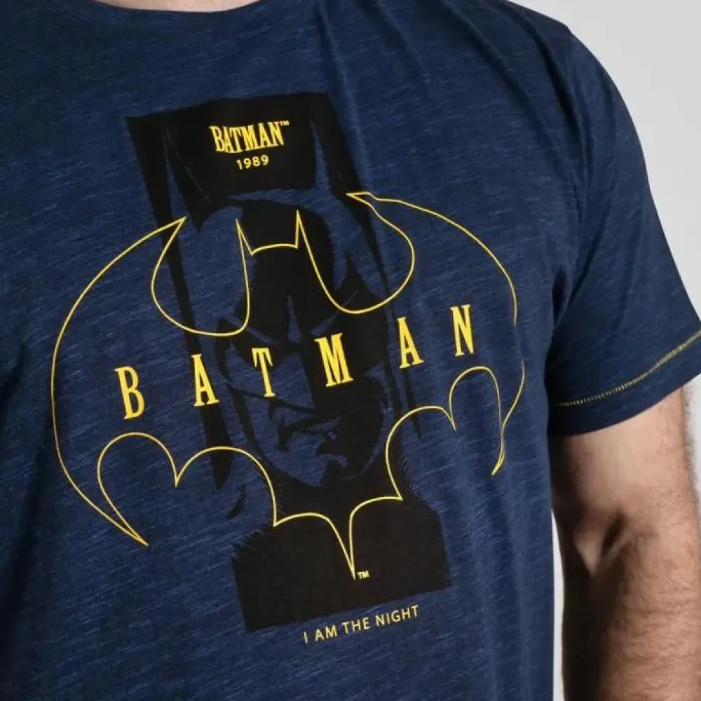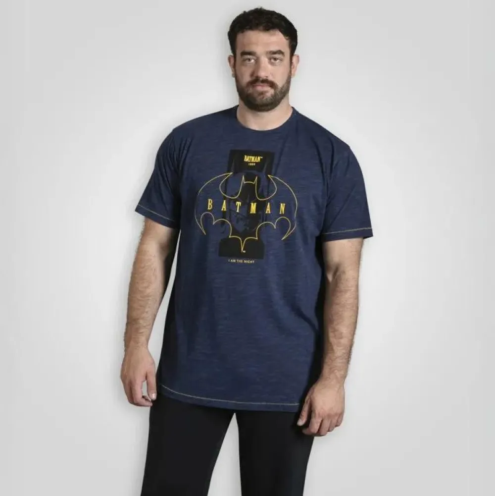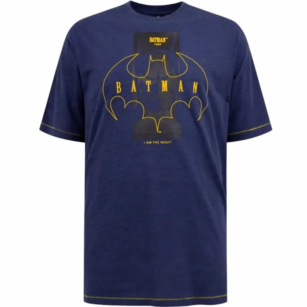 D555 Plus size t-shirt med Batman print på fronten. T-shirten har korte ærmer og rund halsudskæring samt gule stikninger på ærmer og bund.