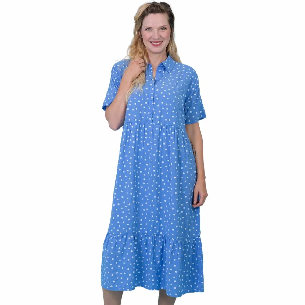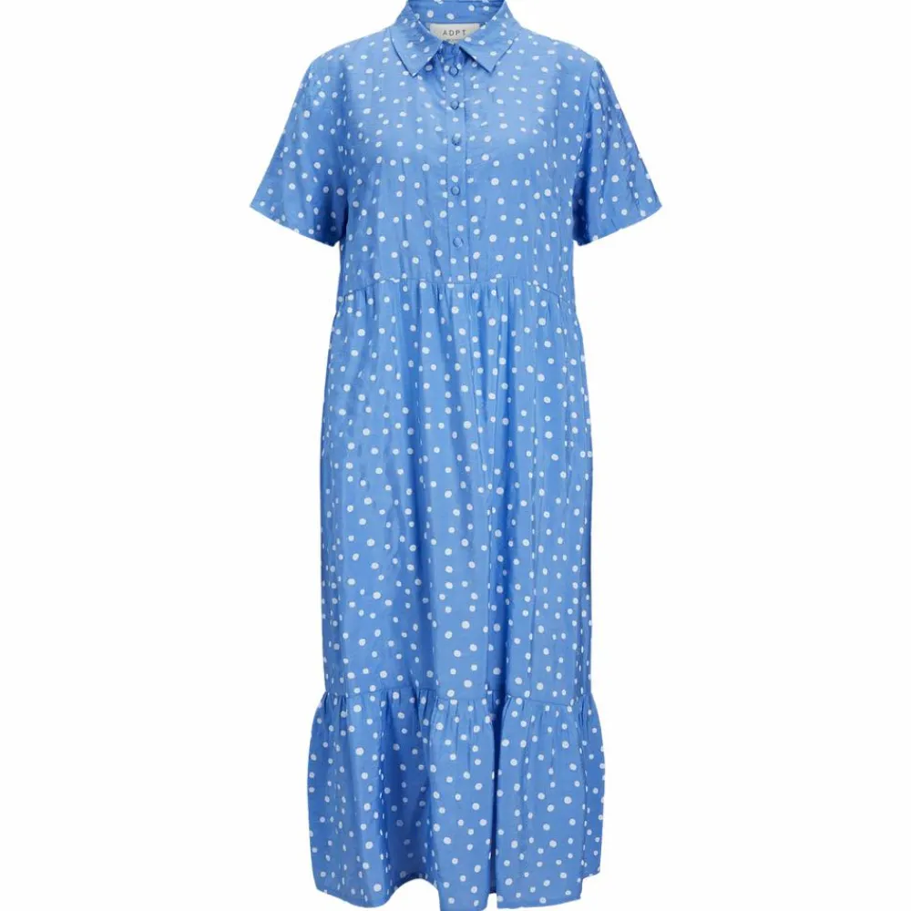 ADPT dame kjole med kortærmer, knapper ved brystet samt krave. Kjolen har prikker samt skæringer