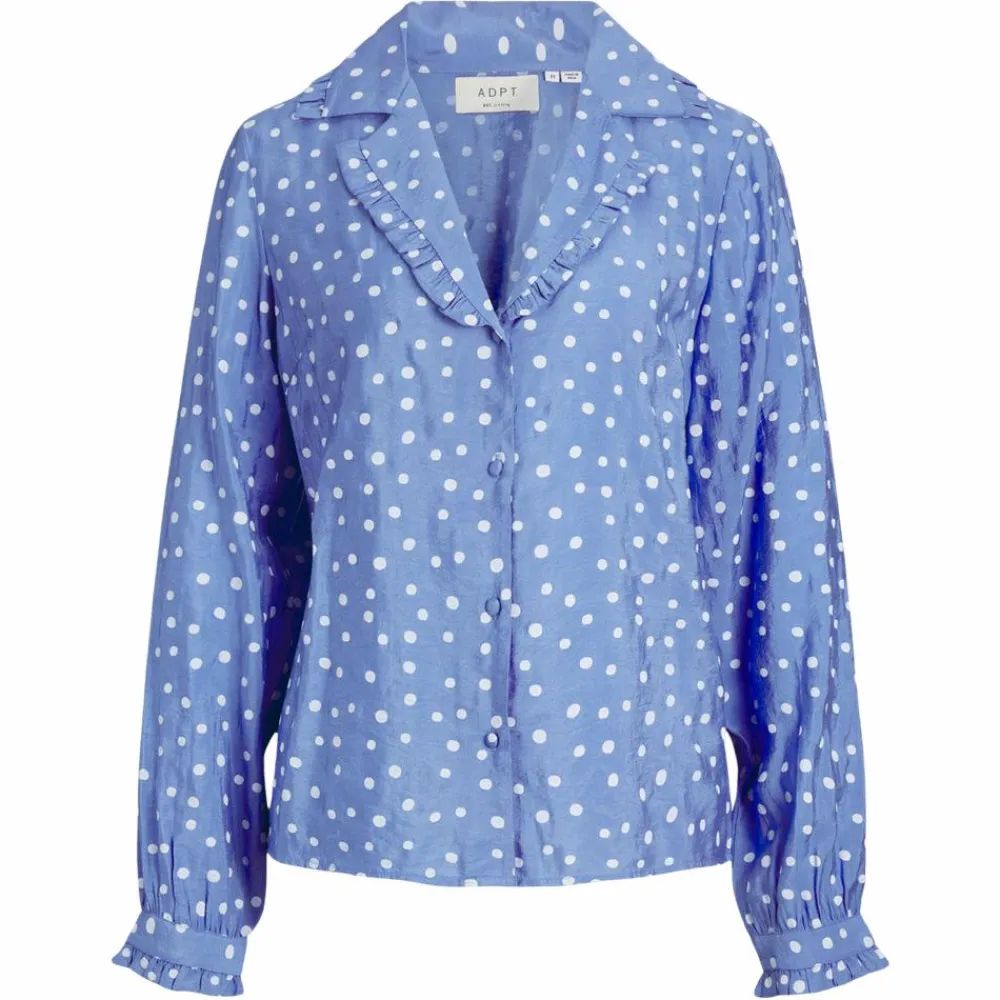 ADPT dame prikket lang ærmet bluse med gennemgående knaplukning, flæse detaljer samt V-udskæring.