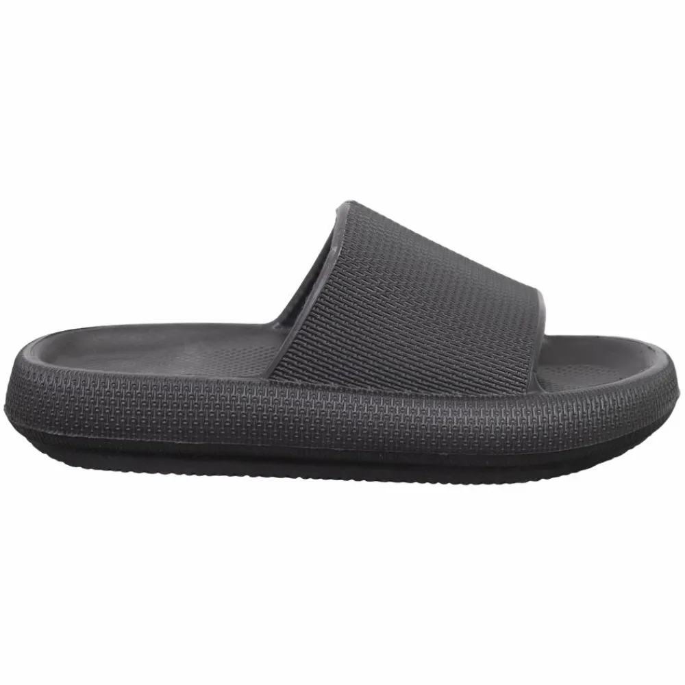 Anyway dame sandaler i ensfarvet sort. Sandalerne har en tyk rem over foden. Sandalerne har en mønstret ydersål, som giver et solidt greb og stabilitet på forskellige underlag.