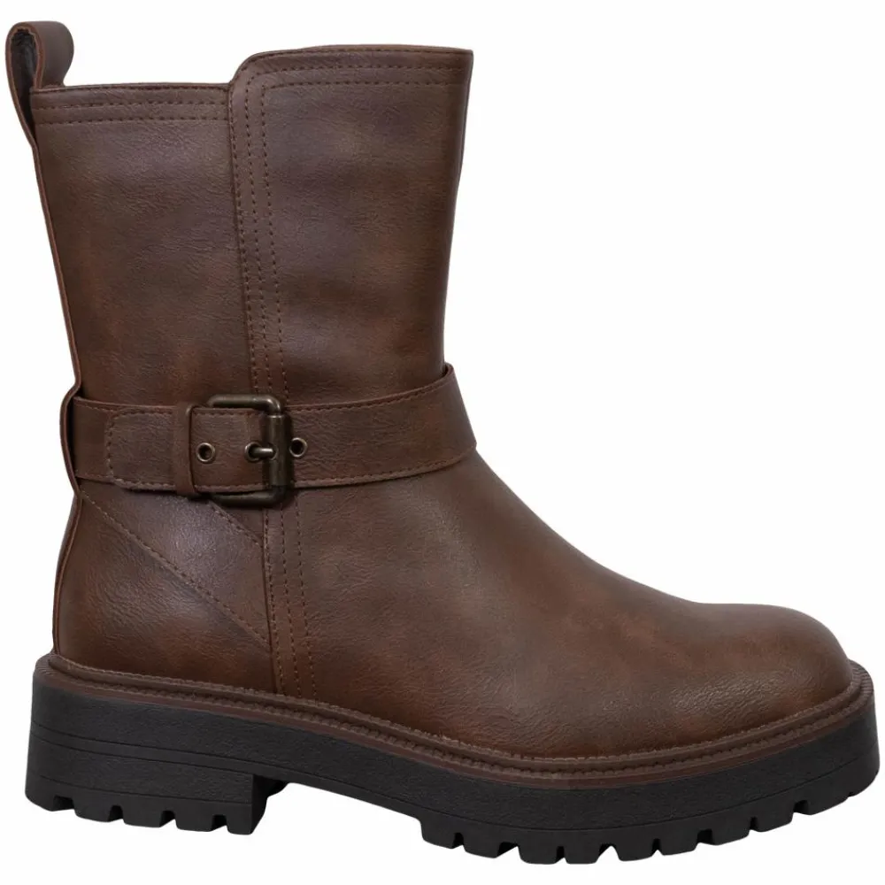 Kastanjebrune dame-støvler med et tidløst udtryk, der balancerer rå kant og hverdagsvenlig komfort. Det midtlange skaft giver god støtte, den runde snude sikrer plads til tæerne, og den markante sål løfter let og står fast på byens underlag. En dekorativ rem med spænde ved anklen sætter et roligt fokus på designet.