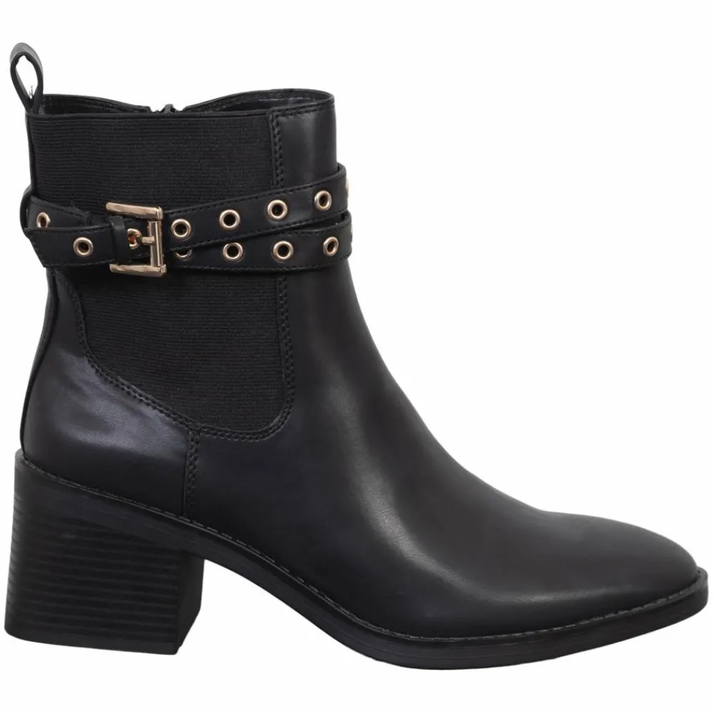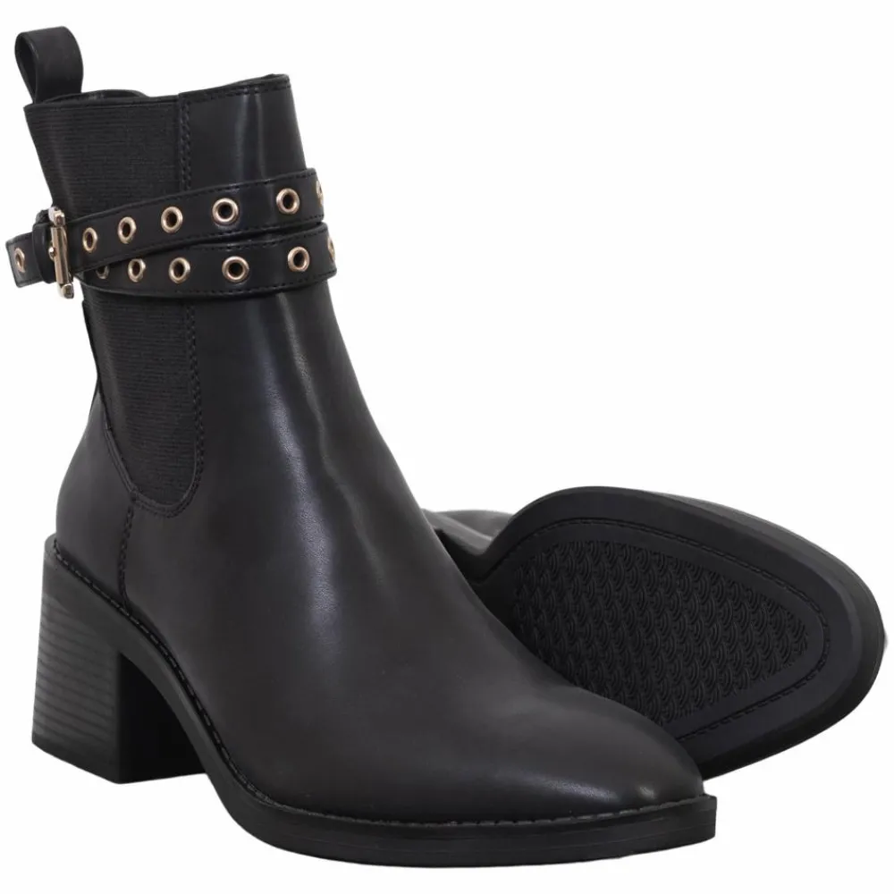 En sort ankelstøvle med moderne kant giver hverdagslooket et løft. Elastiske sider gør den let at få på, mens en stabil blokhæl giver højde uden at gå på kompromis med gåkomfort. Den glatte overflade i syntetisk læder (PU) står skarpt mod guldfarvede detaljer for et rent, feminint udtryk.