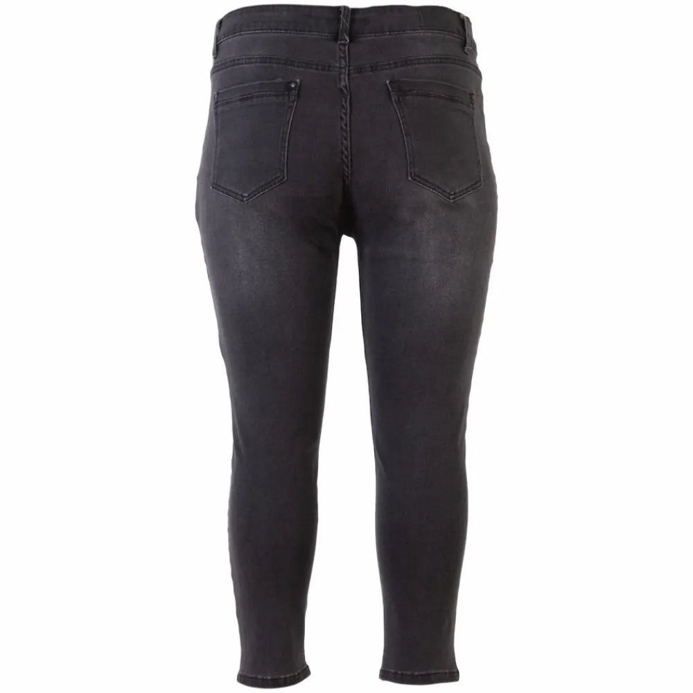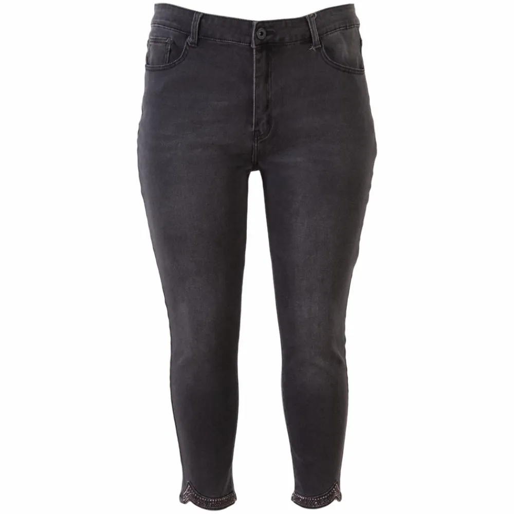 BS plus size jeans i 7/8 længde med sten forneden. Bukserne har fem lommer, bæltestropper samt knap- og lynlåslukning. Buksen har masser af stretch.