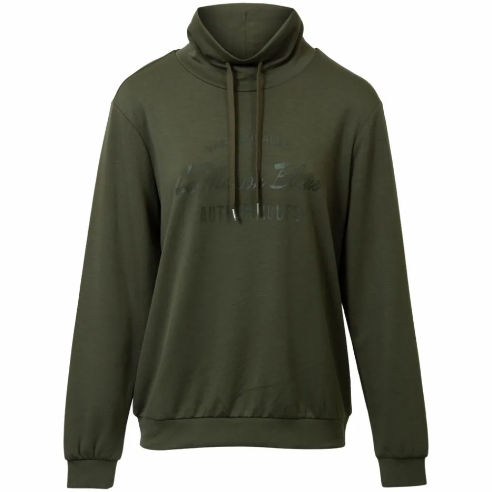 En afslappet sweatshirt til dame i en dyb mørk oliven, der giver et roligt og tidløst udtryk. Den høje krave med justerbar snøre og metalender luner på kølige dage, mens den elastiske kant og manchetter skaber et let puf ved taljen. Et diskret, tonet brysttryk fuldender looket uden at stjæle opmærksomheden.