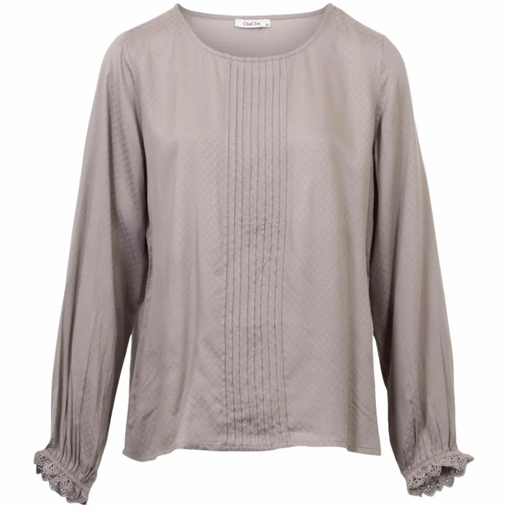 ChaCha dame bluse med fine detaljer. Blusen har en rund halsudskæring, fine drapereringer langs midten på fronten og et flot struktur i materialet. Den er lavet i en let og luftig kvalitet og de lange ærmer har elastik ved håndledet med en broderet flæsekant.
