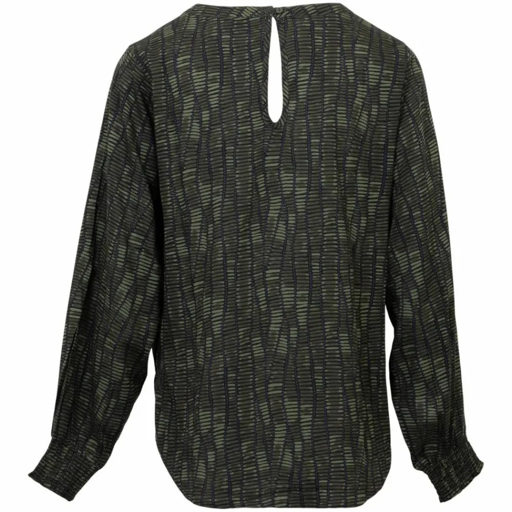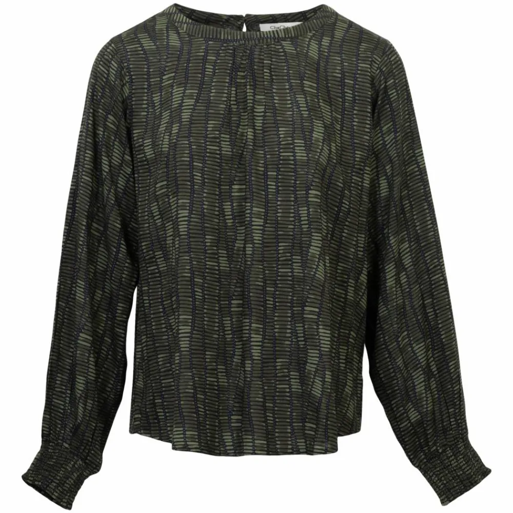 ChaCha bluse til dame. Blusen er lavet i en let og luftig bomuldskvalitet. Den har en rund halsudskæring og bliver lukket med en enkelt knap i nakken. Blusen har lange ærmer med elastik ved ærmeåbning og er en anelse længere bagtil, samt en lille slids i hver side.