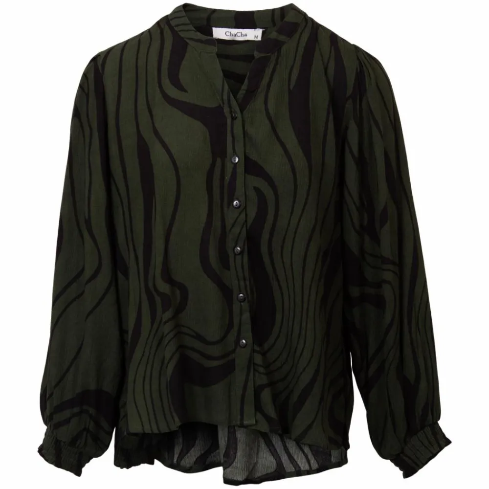 Cha Cha dame bluse. Dejlig let dame bluse med smock i ærmerne og lidt mere længde bagpå end foran. Skjorteblusen har all-over print, samt v-haludskæring.