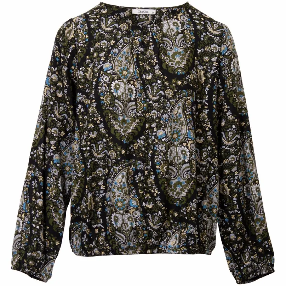 Flot dame bluse med lange ærmer og all-over print. Blusen har en smal elastik ved talje og håndled. Blusen har en fin rynke-effekt ved den runde halsudskæring.