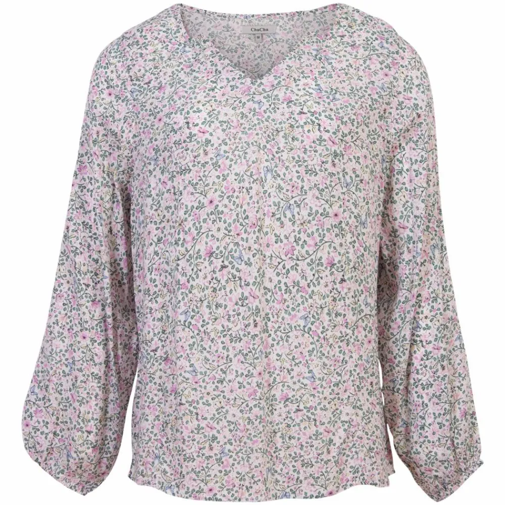 ChaCha dame skjortebluse. Skjorteblusen har all-over print, samt v-haludskæring. Skjorteblusen har elastik i ærmerne, som gør at den tilpasser sig om armene.