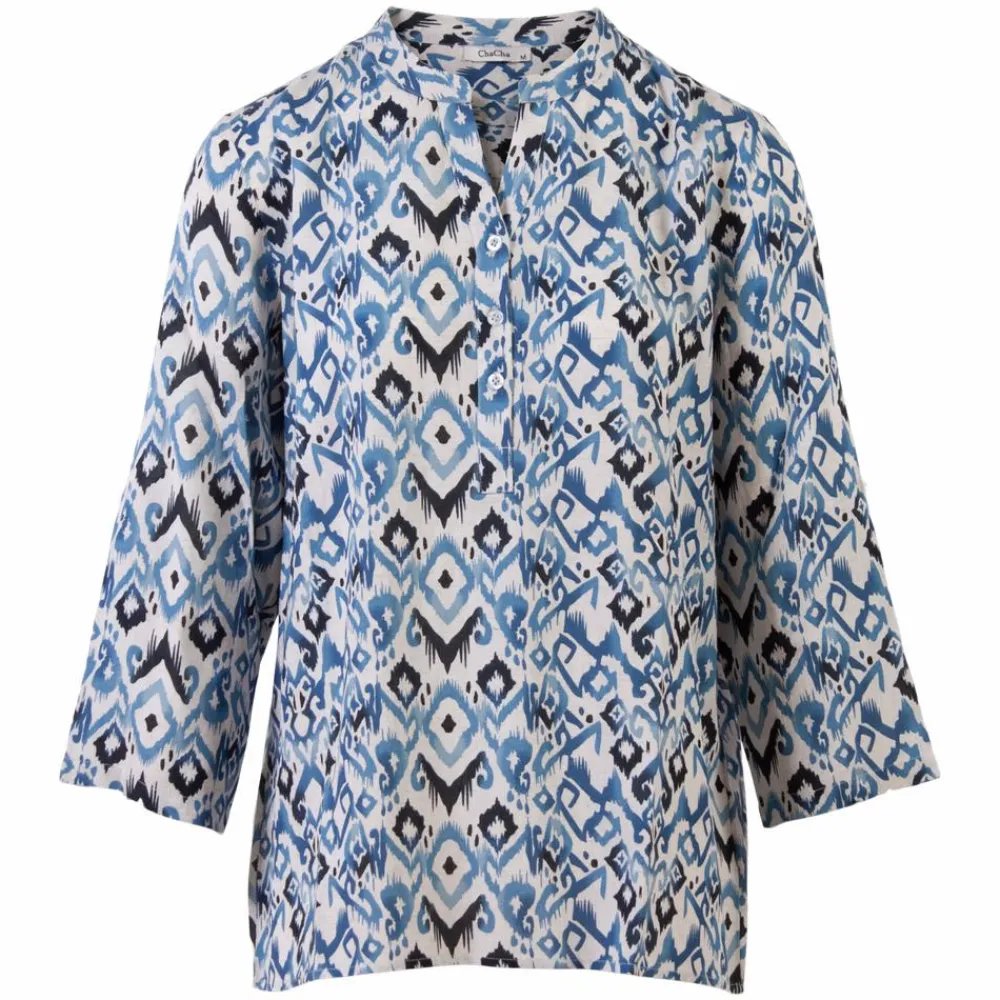 ChaCha dame bluse med all-over print. Blusen har knapper ved brystet, rund halsudskæring samt ærmer med mulighed for opsmøg.