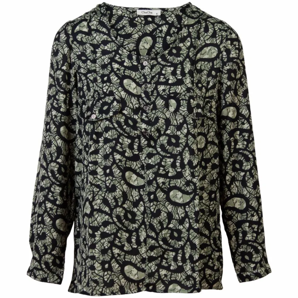 ChaCha dame bluse med all-over print. Blusen har lange ærmer, rund halsudskæring, pynte brystlommer samt pynte knapper ved brystet.
