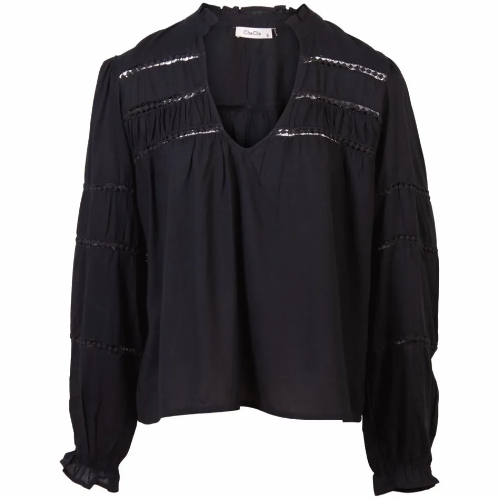 ChaCha dame langærmet bluse med hæklede detaljer og elastik i ærmet. Blusen er designet med V-udskæring samt flæse detalje i kraven