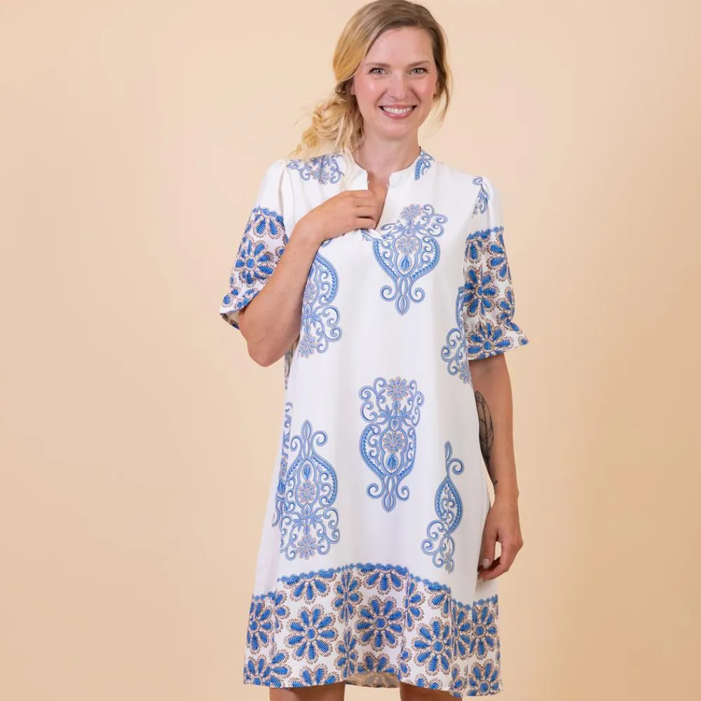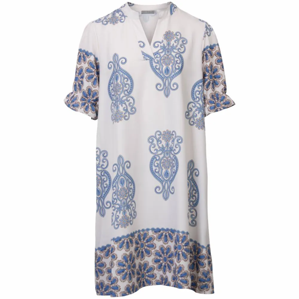 Dame kjole med korte ærmer. Kjolen har et flot print og en tynd elastik i ærmekanten, som giver en fin rynkeeffekt. Kjolen er lidt længere bagpå.