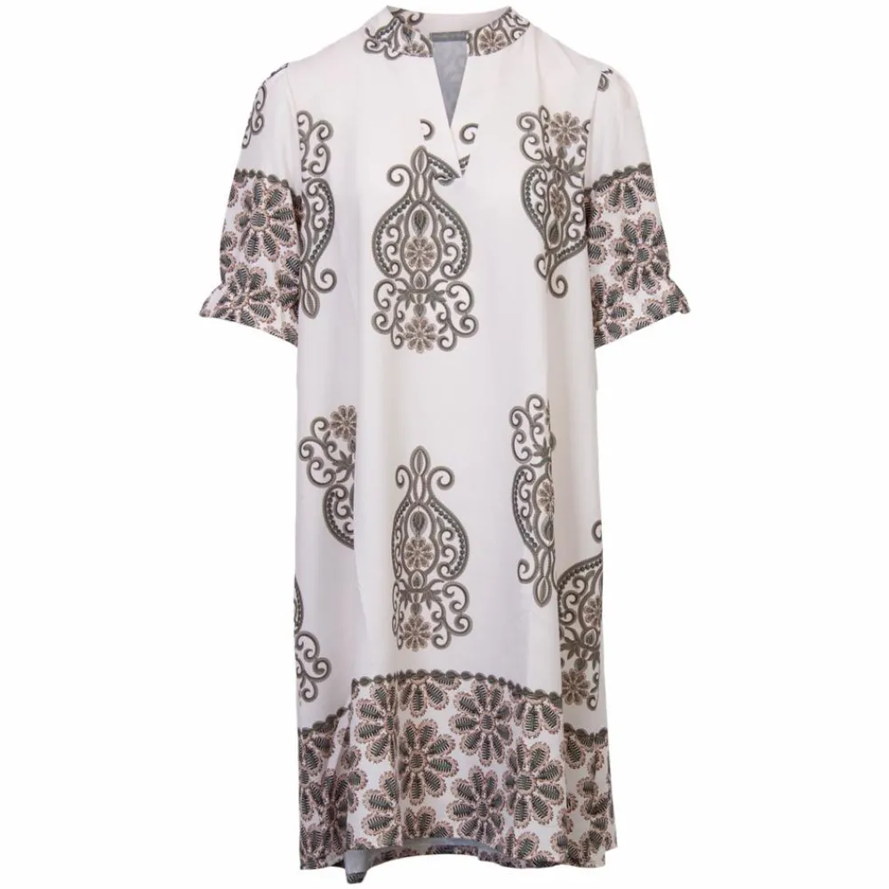 Dame kjole med korte ærmer. Kjolen har et flot print og en tynd elastik i ærmekanten, som giver en fin rynkeeffekt. Kjolen er lidt længere bagpå.