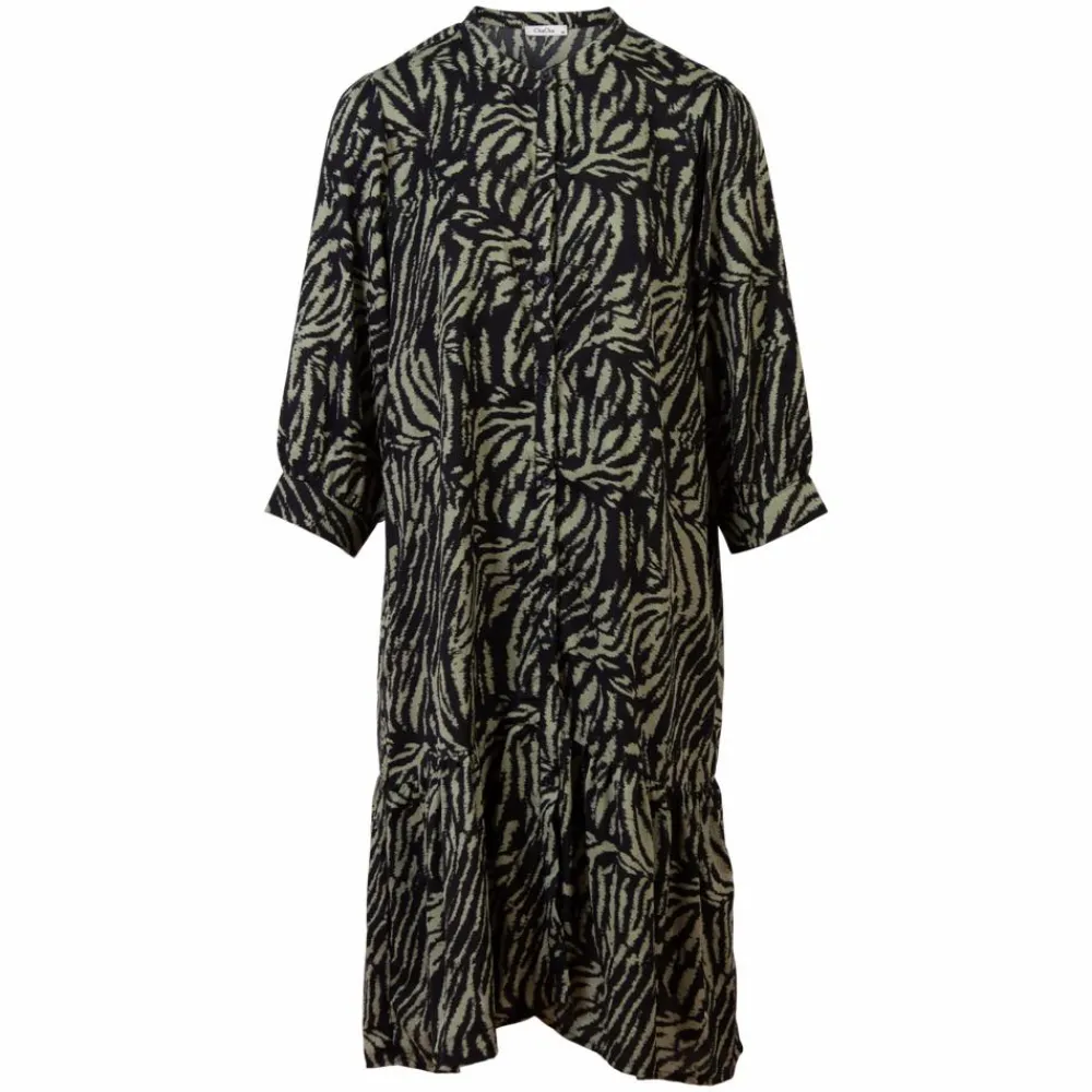 Dame kjole i all-over print. Kjolen har rund halsudskæring, gennemgående knaplukning samt skæring ved bunden, som skaber et let fald til den løse pasform.