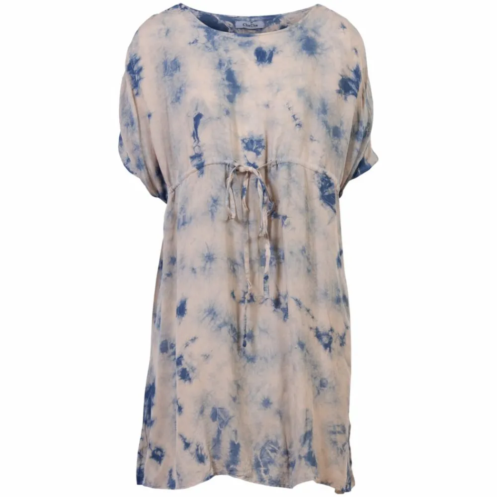 ChaCha dame kjole. Kjolen har gennemgående mønster, samt elastik ved skuldrene, som gør at kjolen tilpasser sig. Kjolen har bindebånd i taljen, som gør at kjolen kan tilpasses om hovedet.