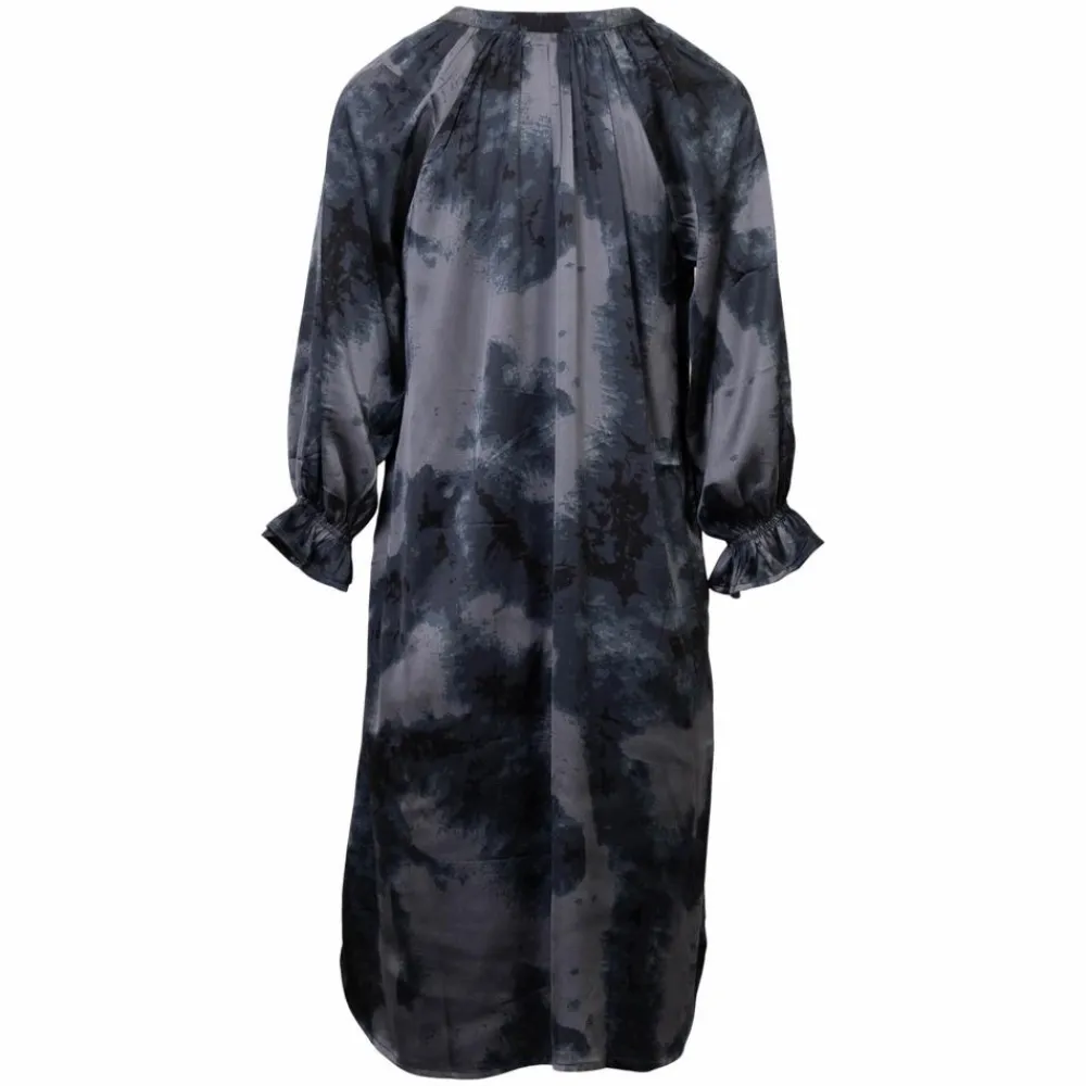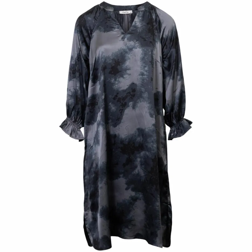 ChaCha elegant satin dame kjole med kinakrave og v-hals. Kjolen er let og luftig, med lange ærmer og en smal elastikkant ved håndleddet. Kjolen er designet i et tie-dye print og det blanke materiale giver et elegant og fint udtryk. Den smalle elastik med rynkeeffekt giver et ekstra feminint twist til kjolen. Den fine kjole kan bruges til både hverdag og fest og er let at style med både støvler, sneakers eller høj hæl.
