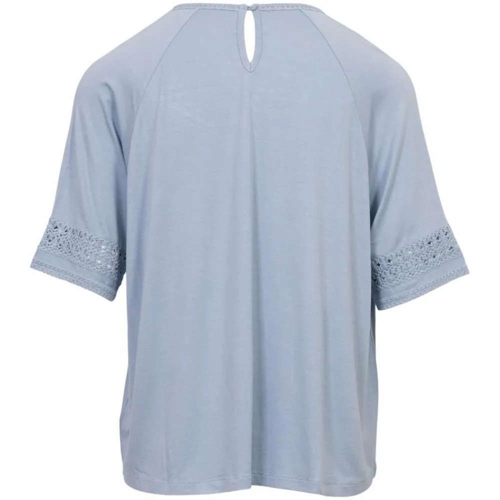 Flot dame t-shirt fra ChaCha med fine detaljer på fronten og ved ærmegab. Blusen får et ekstra strejf af elegance med læg foran, som får blusen til at falde flot på kroppen. Den kortærmede bluse har rund hals og lukkes med en enkelt knappe i nakken.