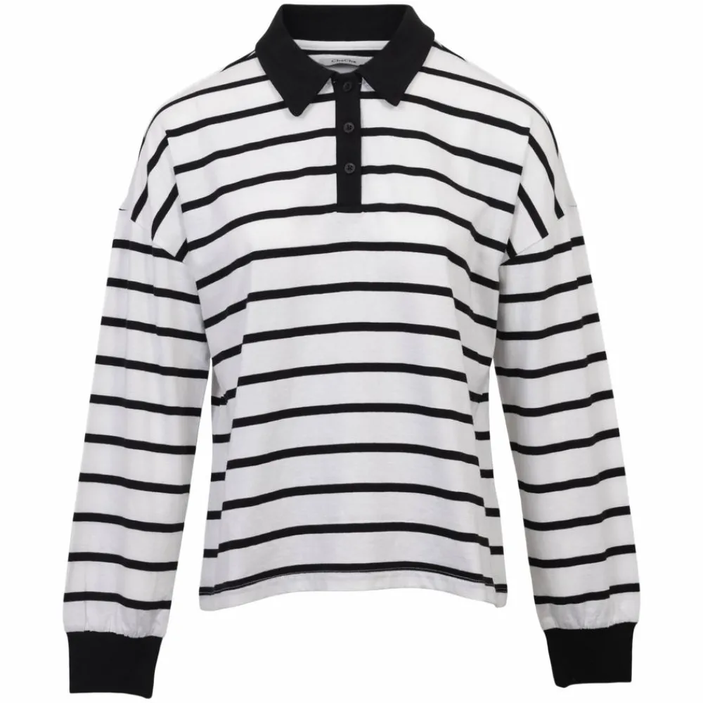 Smart polo trøje til damer. Trøjen har en løs og afslappet pasform, som sikrer komfort og bevægelighed. Den langærmede trøje er designet med den klassiske polokrave og stolpelukning med tre knapper. Blusen har kontrastfarvede striber og trøjen har et smart og sporty look.