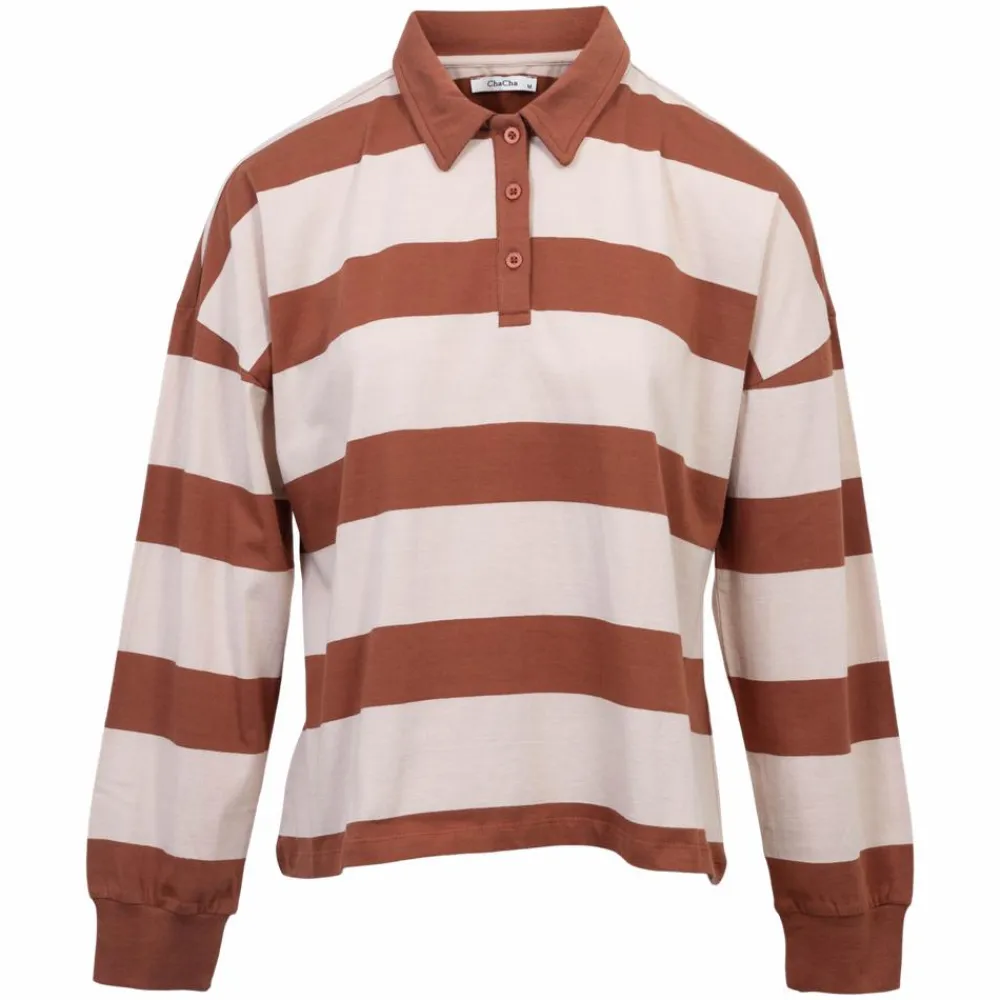 Smart polo trøje til damer. Trøjen har en løs og afslappet pasform, som sikrer komfort og bevægelighed. Den langærmede trøje er designet med den klassiske polokrave og stolpelukning med tre knapper. Blusen har kontrastfarvede striber og trøjen har et smart og sporty look.
